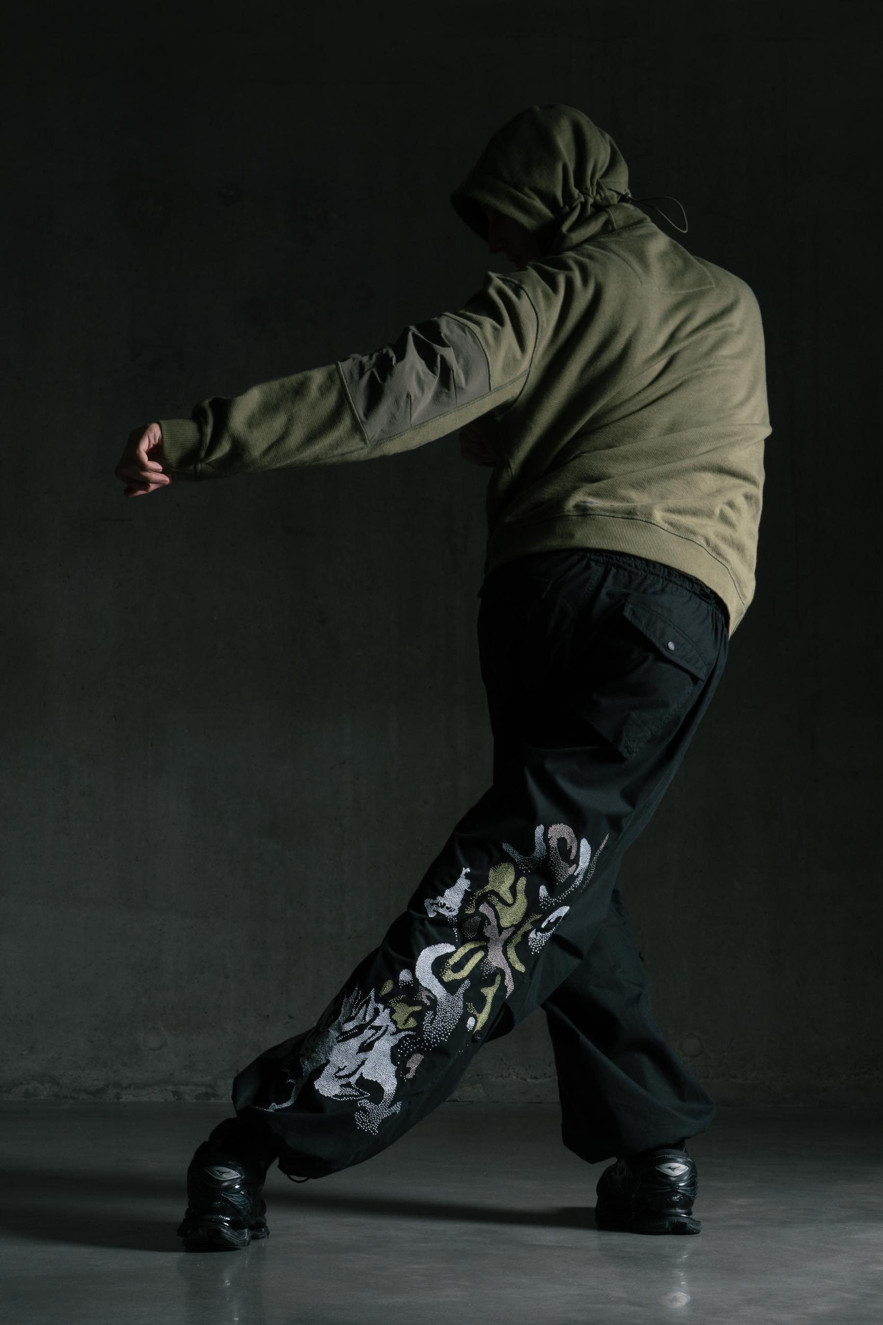 The style was loosely based on white U.S. Army Snow Camouflage over Trousers – intended to be worn over a full combat uniform as camouflage in snowy terrain. Maharishi improved the original design – adjusting the pattern, adding pocket bags, elasticated waist and hem adjustable ties.