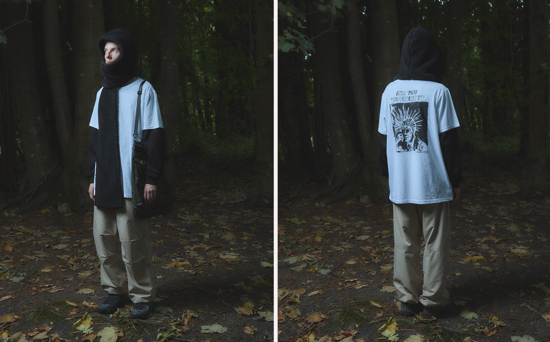 Reinterpreting these processes through hand-machined embroidery on heavyweight Melton Wools, Original Snopants® and a celebration of woodblock prints on Organic Cotton jersey, bringing light to an art movement swept away due to the end of Japan's Edo period.