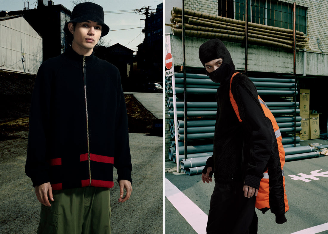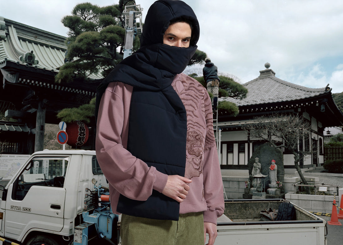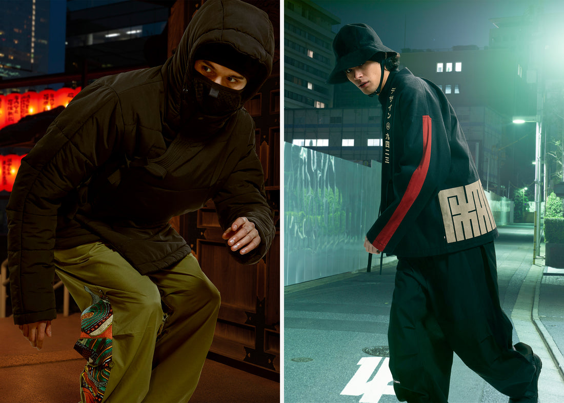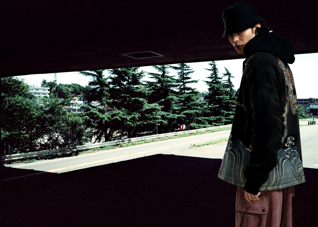 Key cloths include a Pearl Weave Cotton, based on those used in early Japanese fire-fighter kimonos, artworks from ukiyo-e masters Kuniteru and Kuniyoshi serve as decoration for outerwear lining, Italian Cupro Twill shirts and hand-machine embroideries.