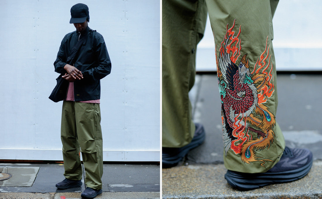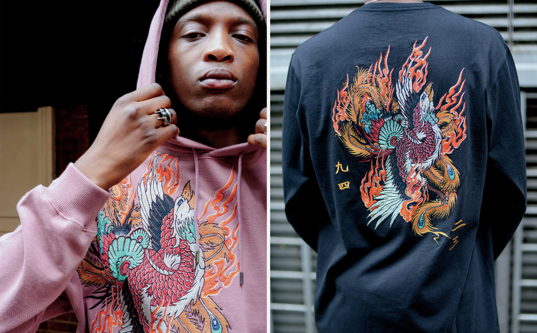 Maharishi presents a Fire Phoenix rising from it's ashes, referencing the work of previous Ukiyo-e masters Koryusai and Bairei as a vivid hand-machined embroidery on Original Snopants®, heavyweight organic cotton sweats and a modified MA-1 flight jacket.