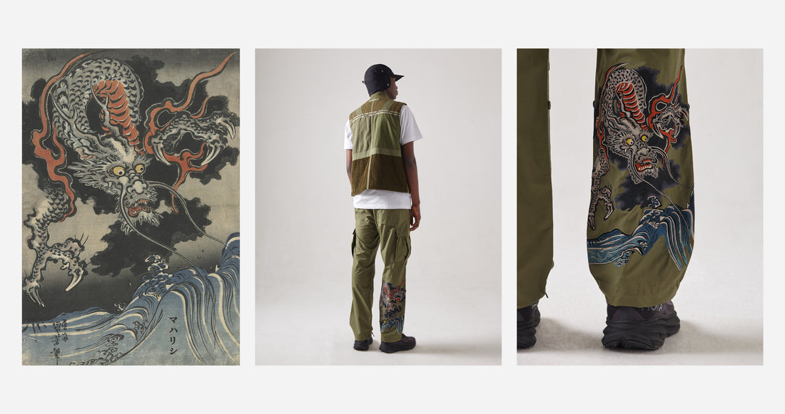 Left: Utagawa Kuniyoshi, Dragons and Waves, ca. 1827-31 · Right: 4624 Sue-Ryu Straight Cargo Snopants®
