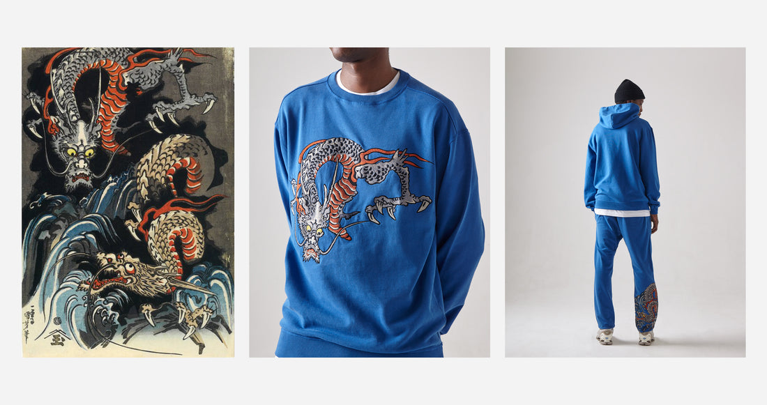 Left: Utagawa Kuniyoshi, Two Dragons by a Waterfall, ca. 1827-31 · Right: 4542 Duelling Dragons Crew Sweat, 4543 Duelling Dragons Sweatpants