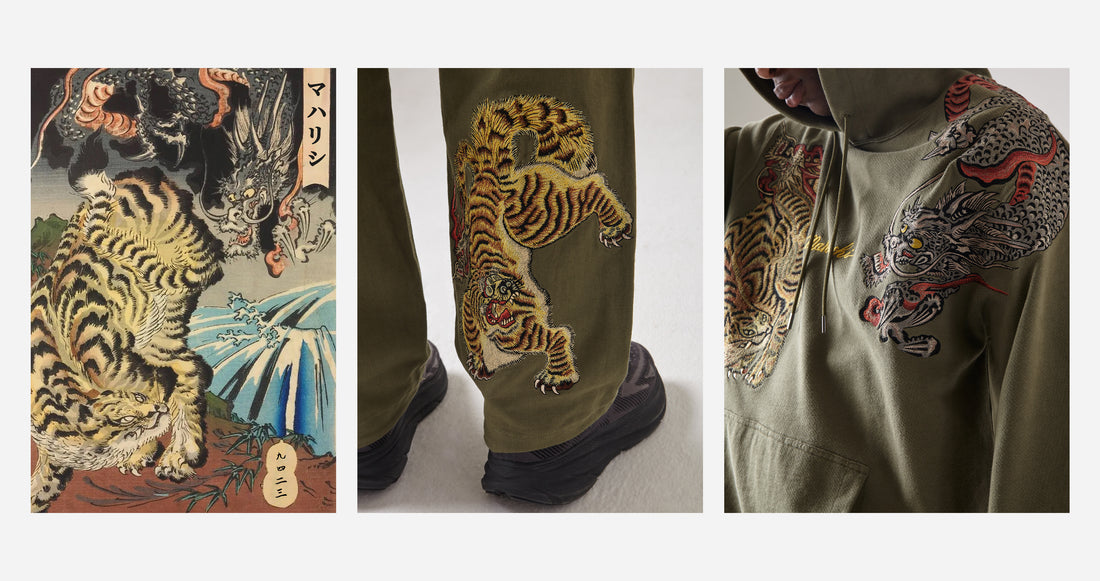Maharishi presents its latest series of artworks inspired by the master Ukiyo-e artist Utagawa Kuniyoshi for Autumn / Winter 2023. Originally a painter, his work stood out amongst others due to his depictions of legendary samurai battles, mythical animals and vivid landscapes.