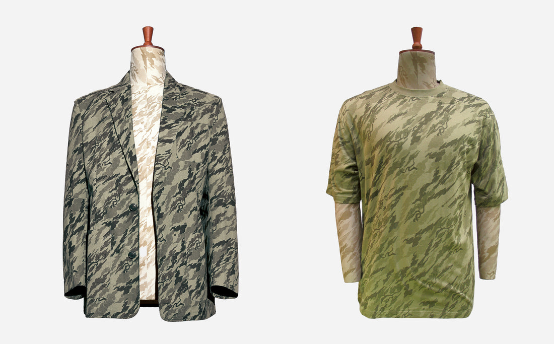 Left: Maharishi 'Bonsai Forest' camouflage cotton tussar blazer, Spring/Summer 2004. Right: Maharishi 'Bonsai Forest' jersey T-shirt, Spring/Summer 2003.