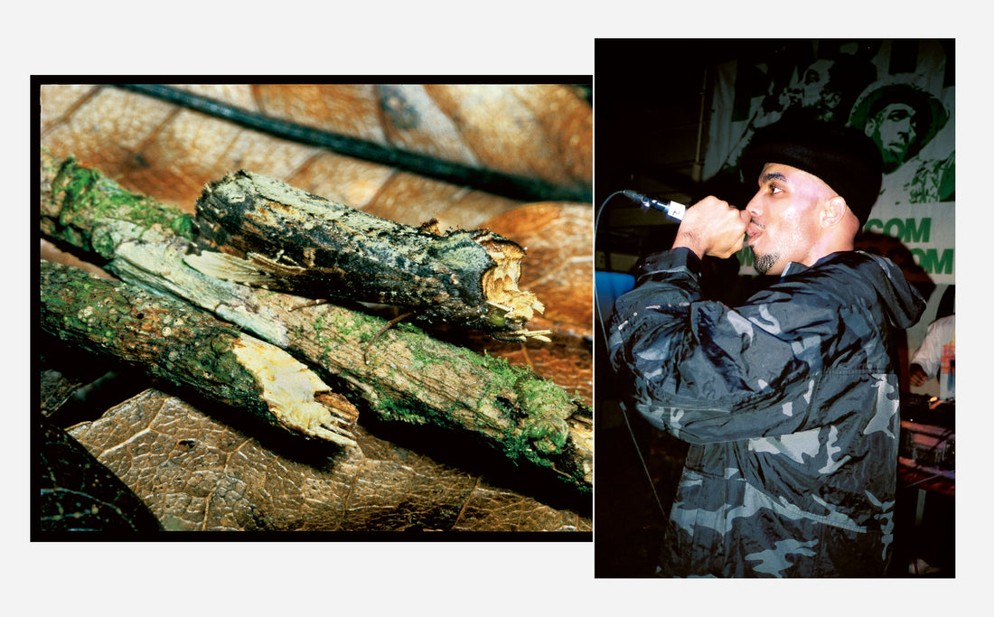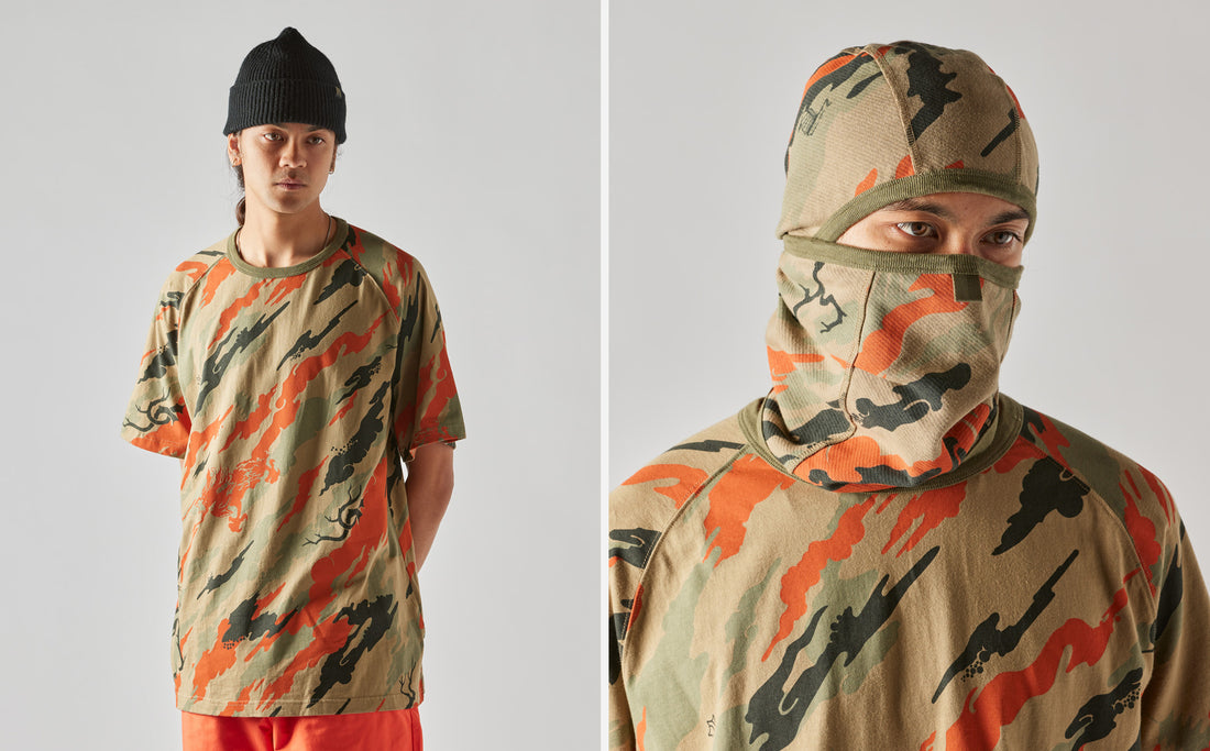 Multiple DPM patterns have been incorporated in every collection since its inception. In addition to these seasonal camouflages, Maharishi has had their own perennial house camouflage pattern, DPM: Bonsai Forest, in constant use since 1999. Originally inspired by an antique Chinese watercolour named “Bonsai Cloud Forest” this has evolved to have many variants over the years but each one incorporates symbols of peace and nature such as bonsai trees growing from heavenly clouds as well as temples, snowy mountain peaks, Hindu Aums and Katakana script. Also featured in later variants is one of Maharishi’s most iconic graphics, a Chinese dragon chasing a flaming pearl of wisdom. Maharishi’s use of dragon iconography is based on the concept that a serpent, the most physically earthbound of creatures with its entire body laying on the ground, represents the unenlightened man and the Dragon represents man leaving the physical earth, taking flight on a spiritual journey to acquire the pearl of wisdom.