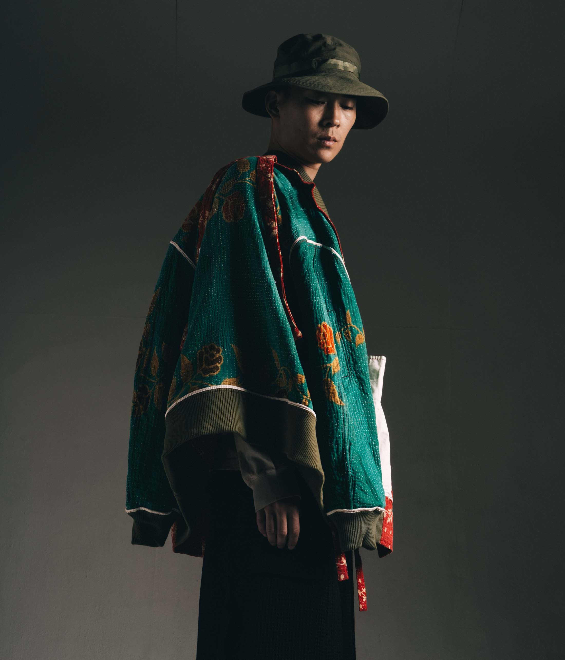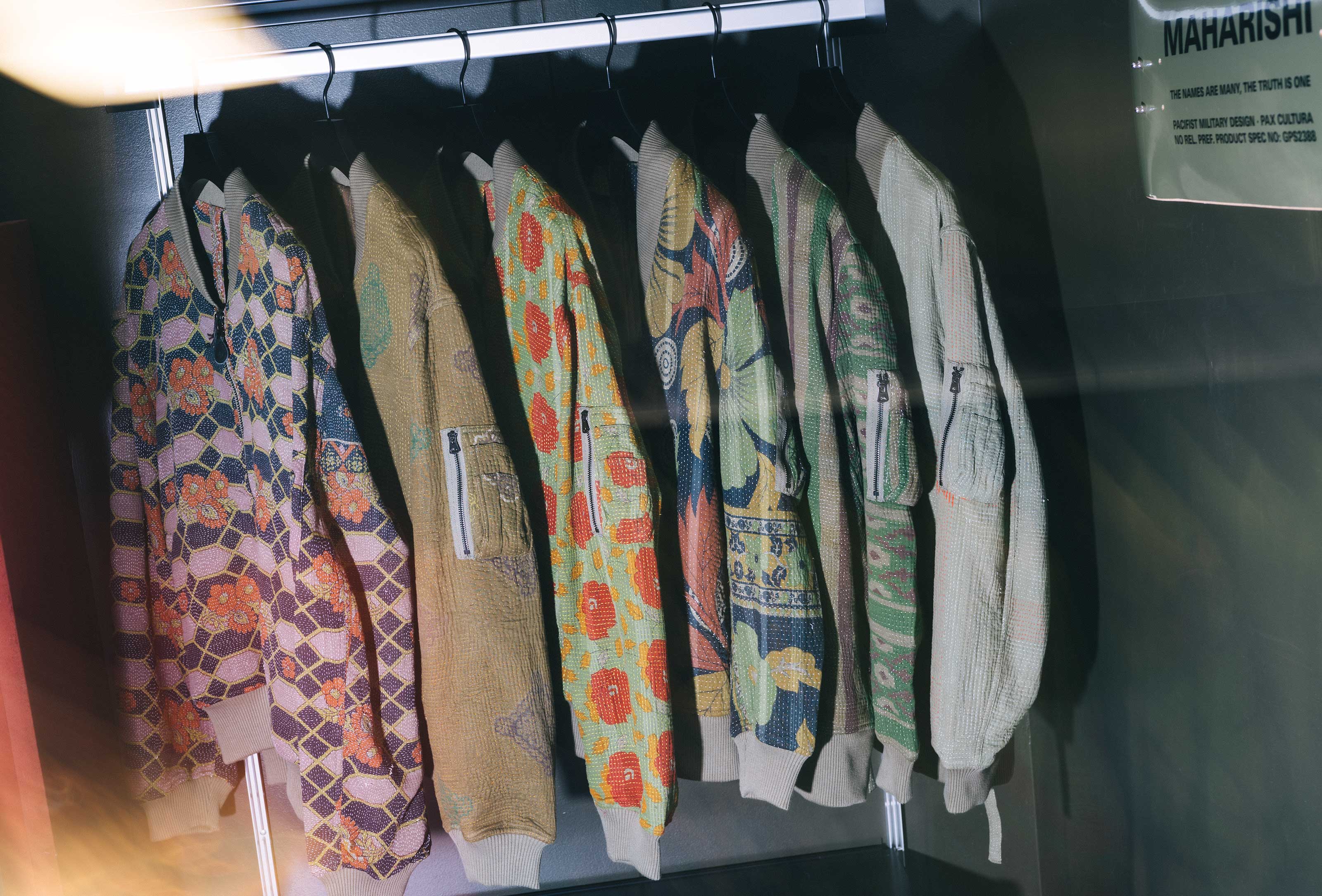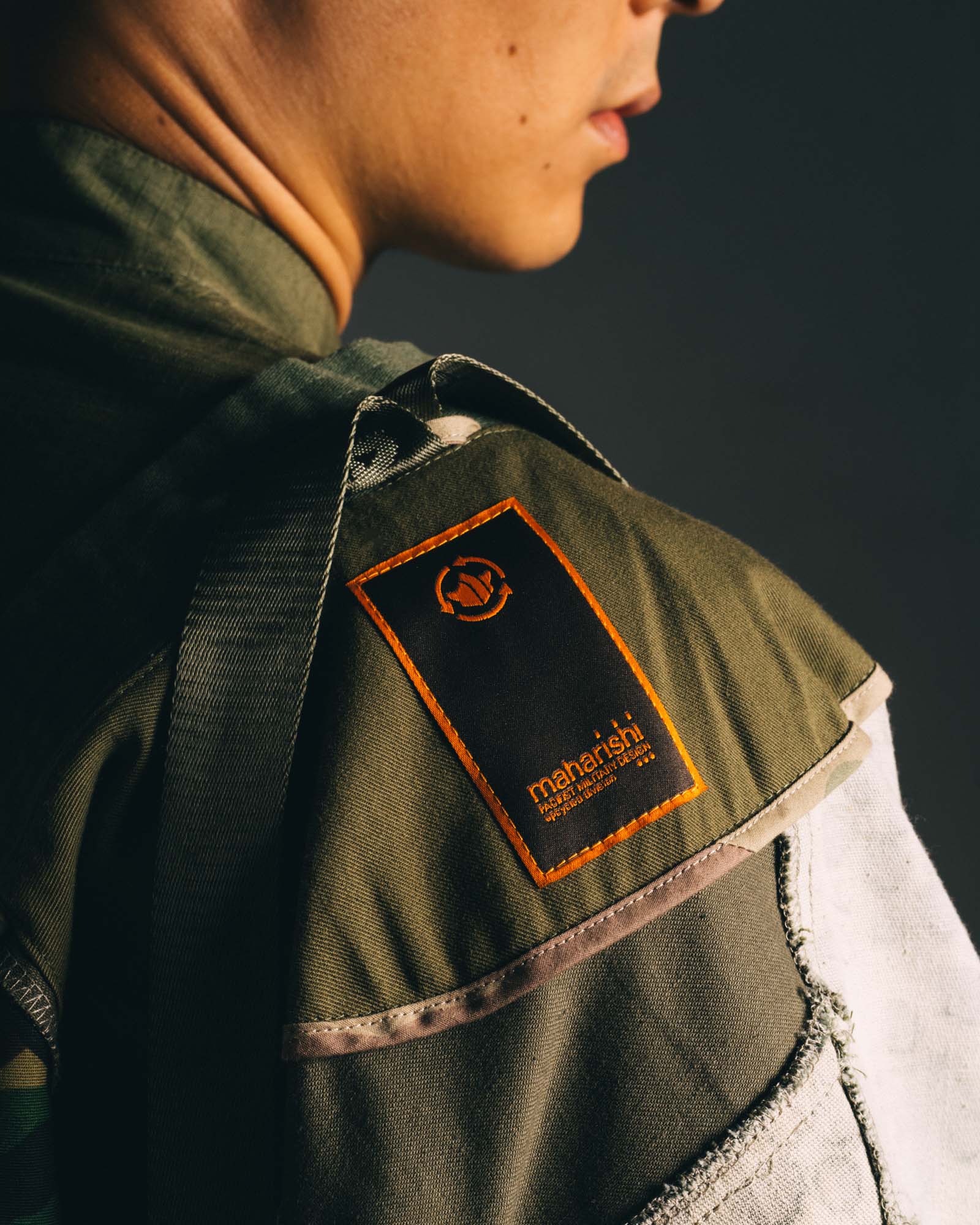 Each jacket is created by recycling vintage, lightweight printed cloths into multiple layers through hand stitching to create a new cloth, designed to mimic the padded nylon of a typical MA1 flight jacket. This rich heritage fabric is reinterpreted through Maharishi’s lens, bringing together artisanal craft and contemporary silhouettes.
