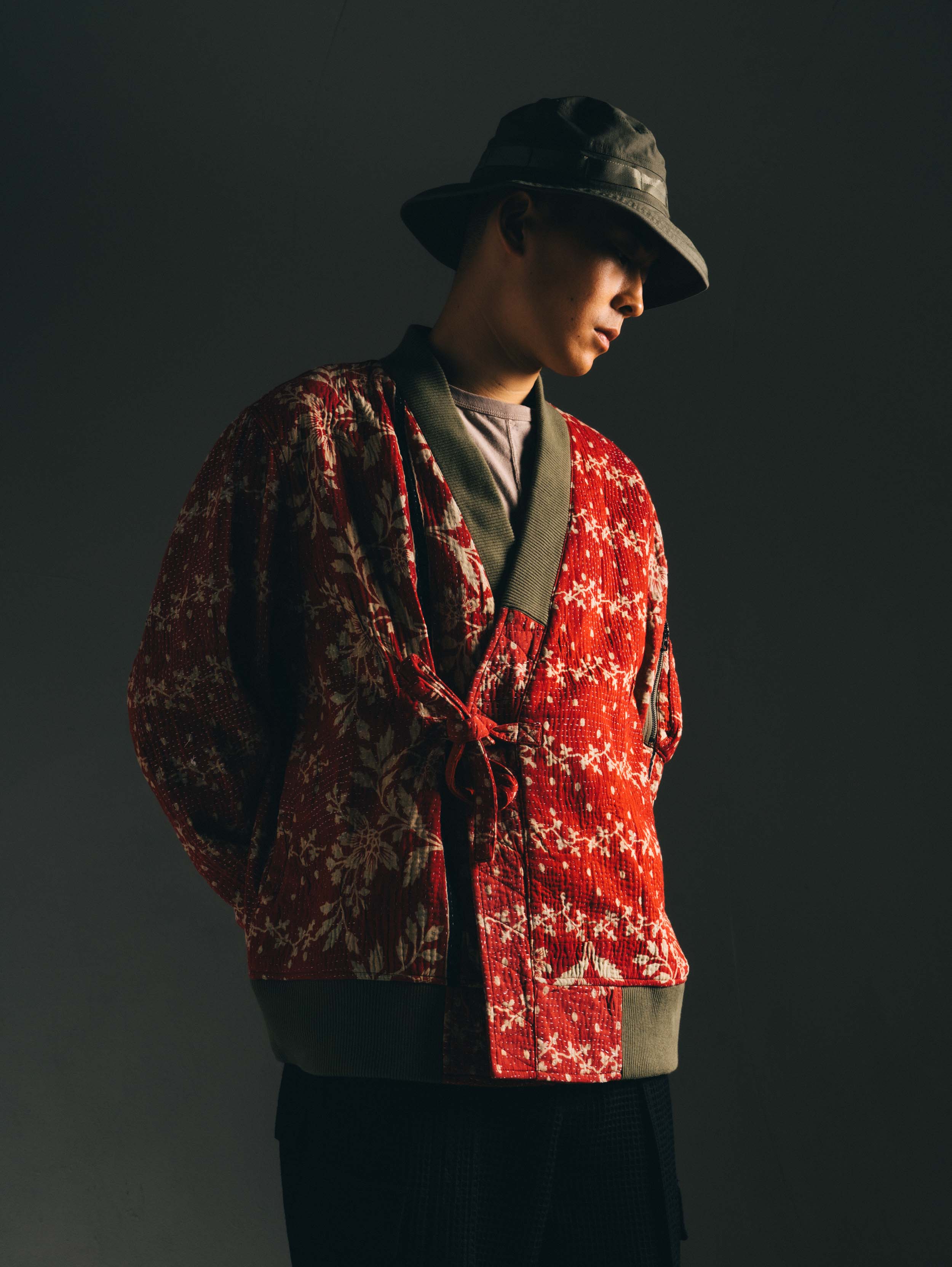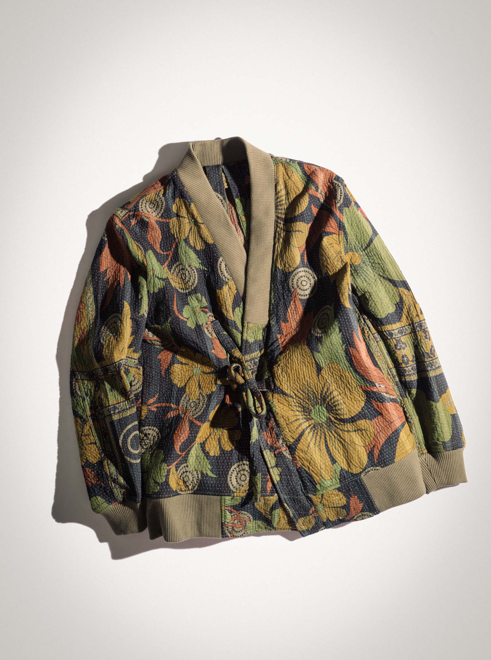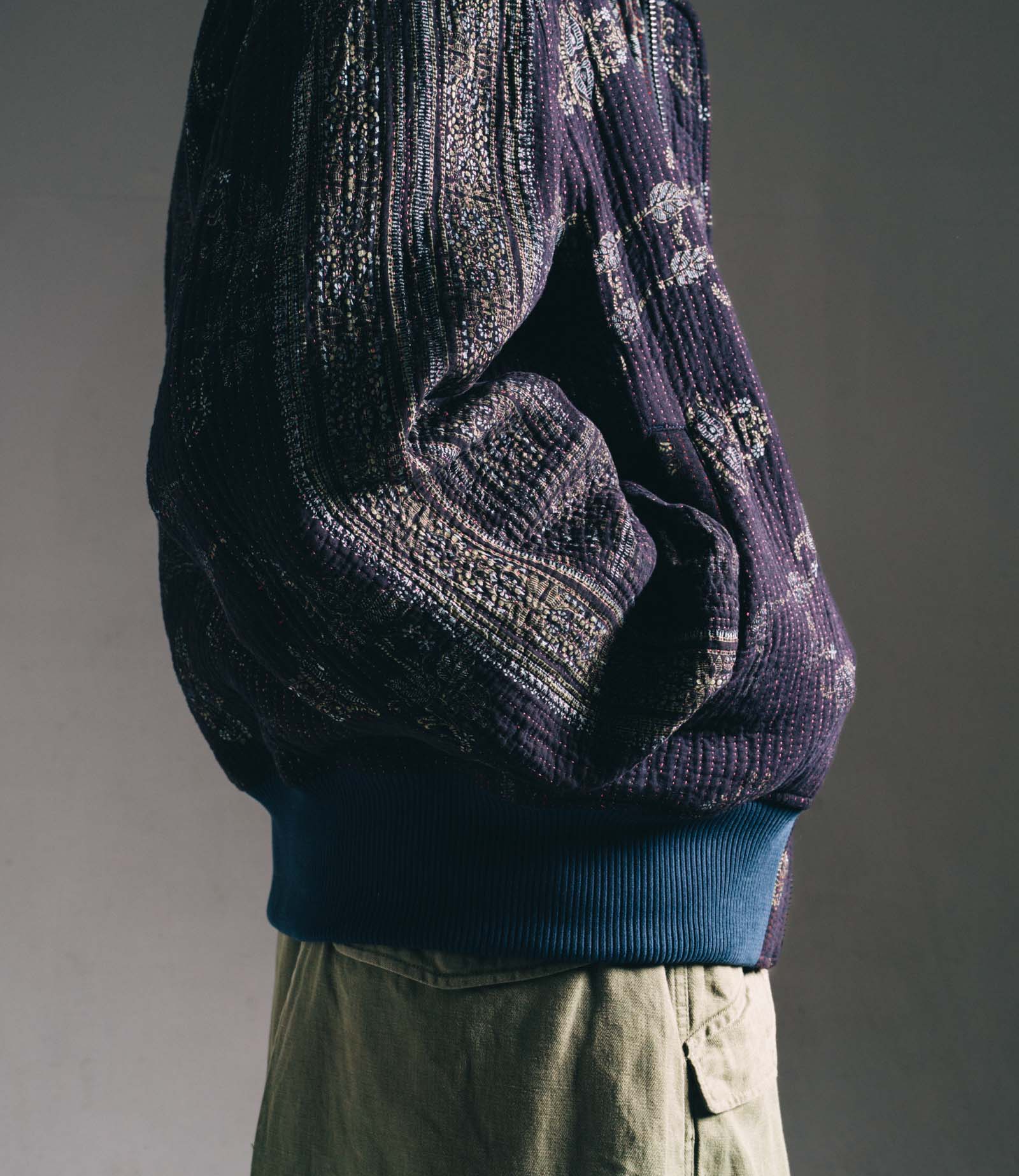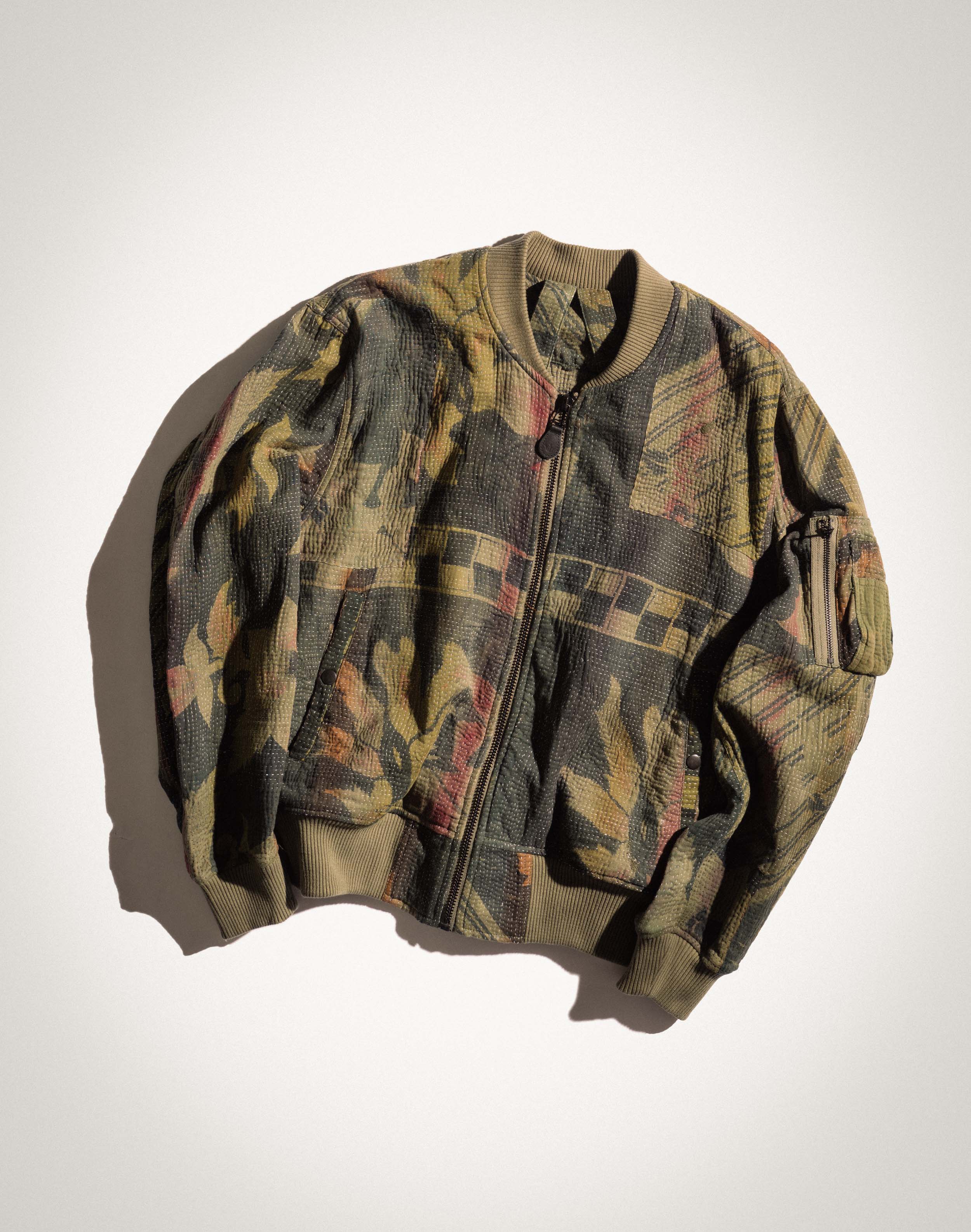Each jacket is created by recycling vintage, lightweight printed cloths into multiple layers through hand stitching to create a new cloth, designed to mimic the padded nylon of a typical MA1 flight jacket. This rich heritage fabric is reinterpreted through Maharishi’s lens, bringing together artisanal craft and contemporary silhouettes.
