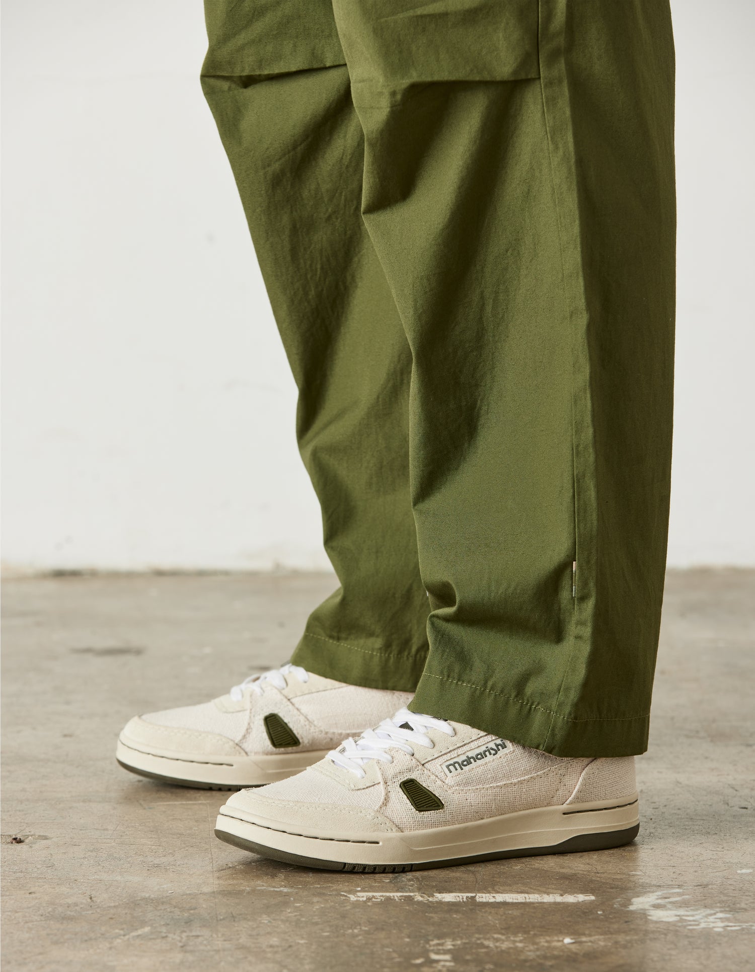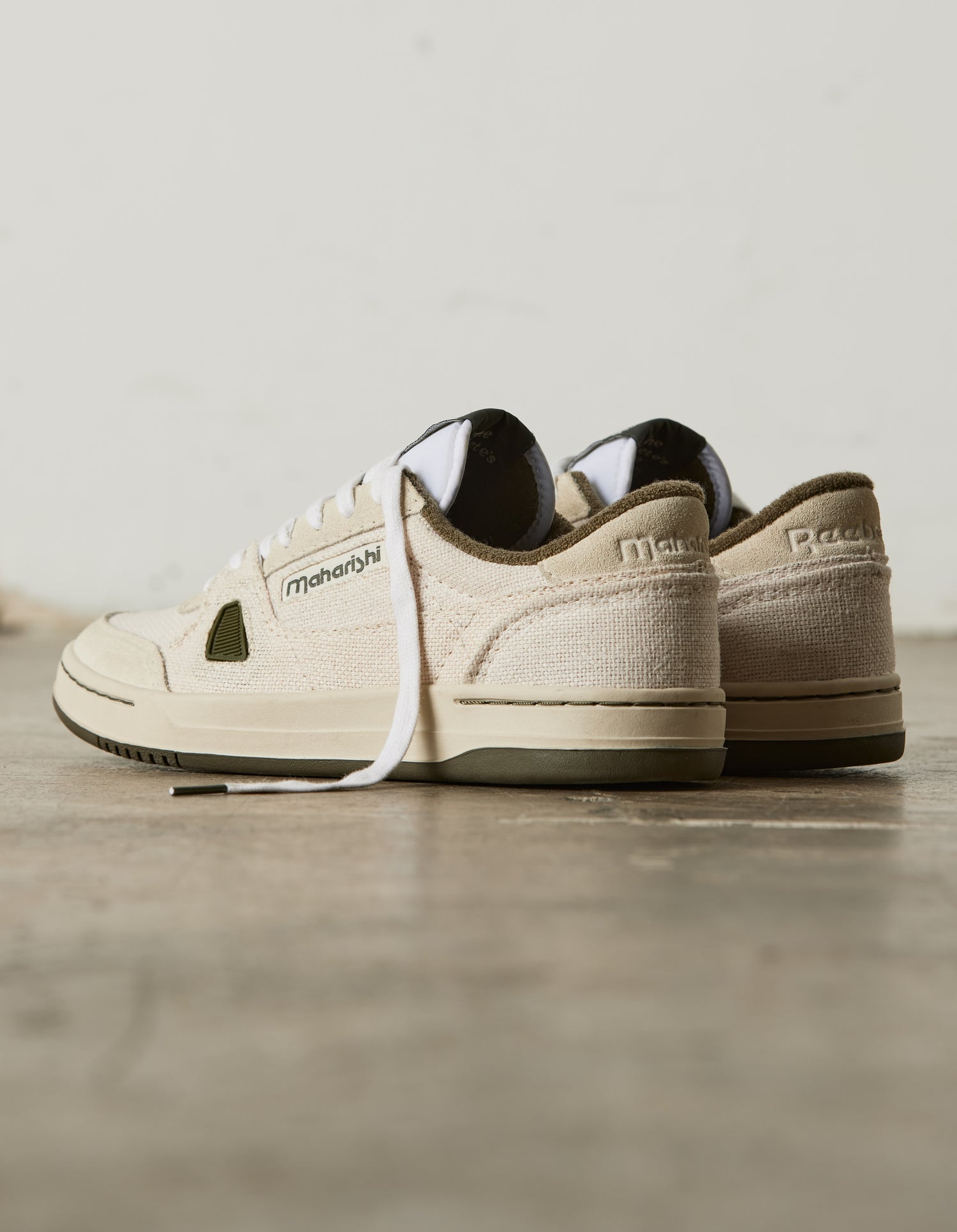 As a testament to Maharishi’s continued efforts to produce ethically-sound, long lasting and environmentally sustainable clothing, the second collaborative output with Massachusetts-based, British founded sportswear company sees the LT Court built with an army green rubber outsole, chalk midsole, and an off-white hemp fabric upper. Maharishi’s LT Court Hemp offers a natural, understated take on the 40-year-old court model.