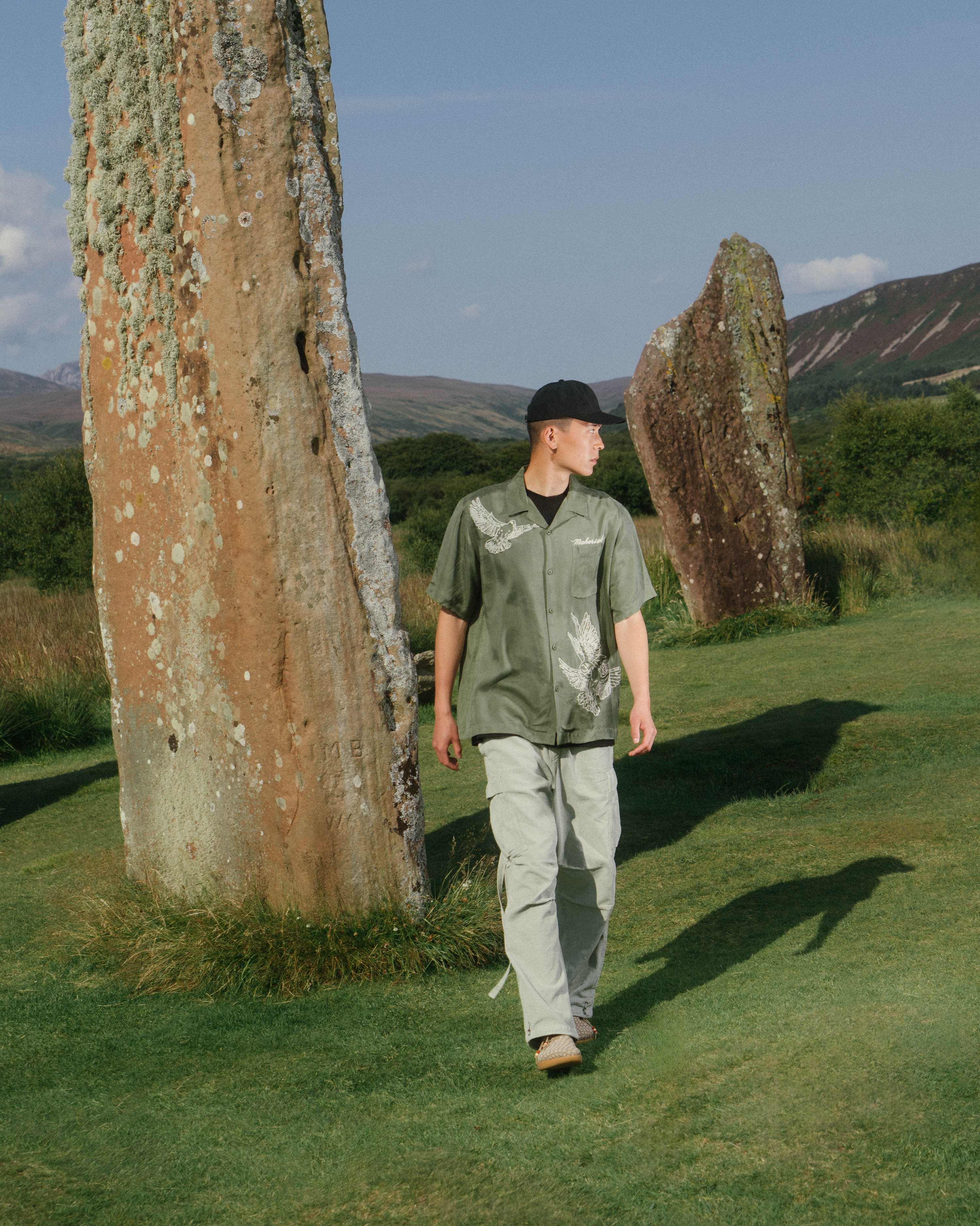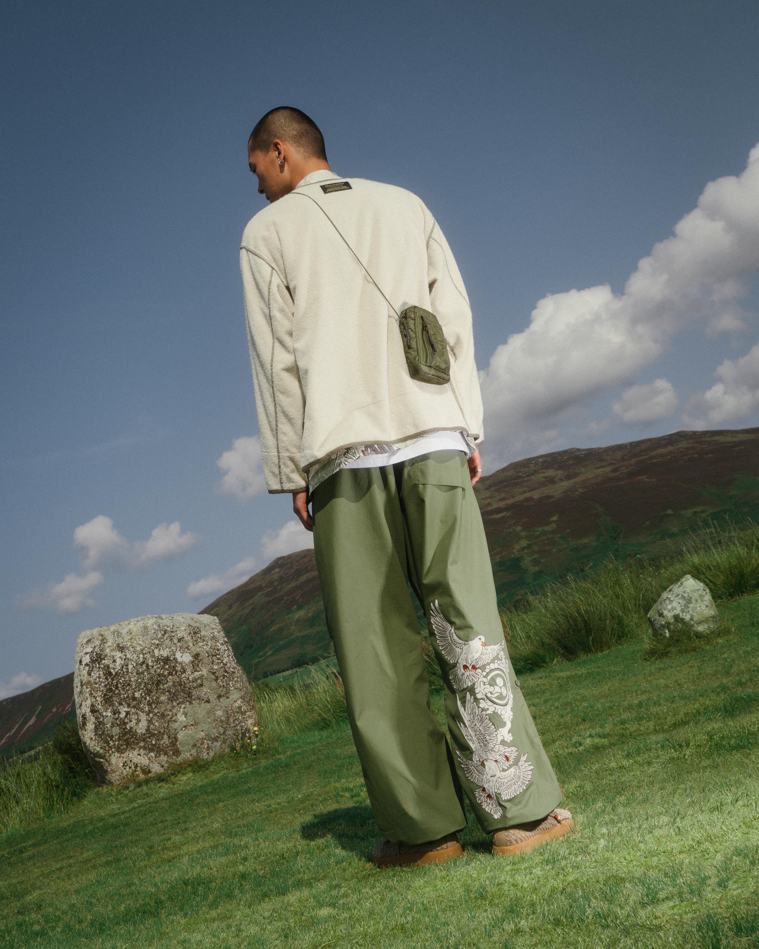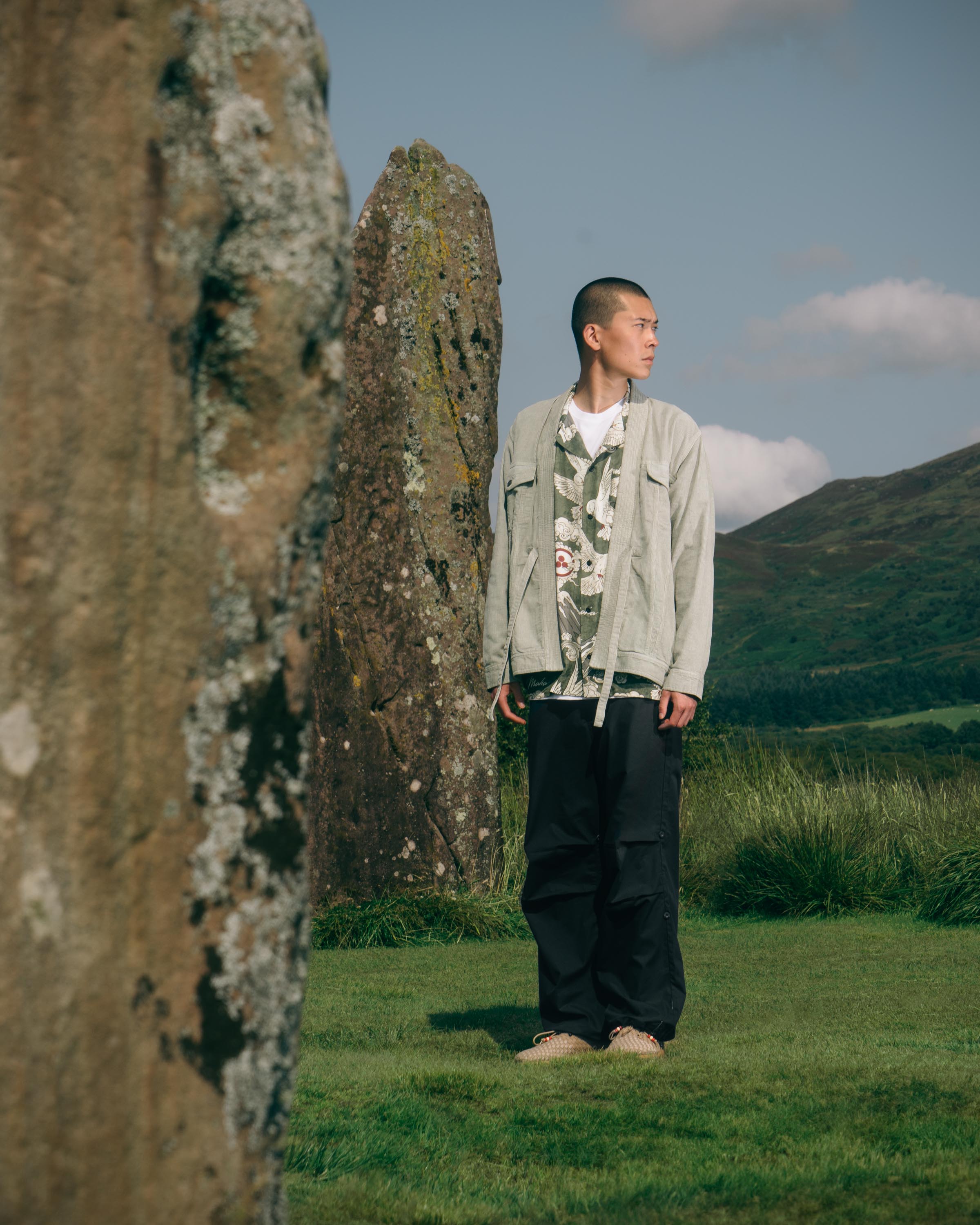 Shown against a backdrop of the Isle’s standing rocks, the imagery re-connects Maharishi’s designs to the natural world and intertwines the brand’s own values with the spiritual importance of the Isle of Arran.
