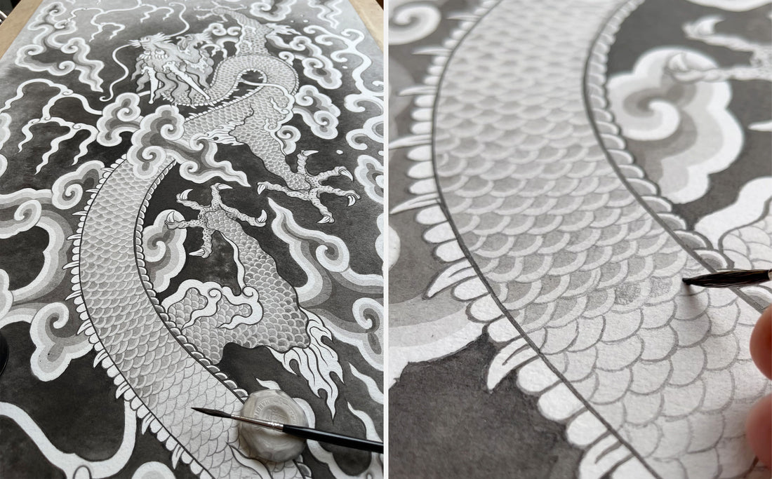 An elaborate Qing Inked Dragon, in delicate tonal washing of ink and refined detailing, was initially inspired by the highly evolved style of the Qing Dynasty. As Chinese art influenced East Tibetan art, this developed the gracious painting style known as the Karma Gadri tradition, of which Tashi trained as a young monk.