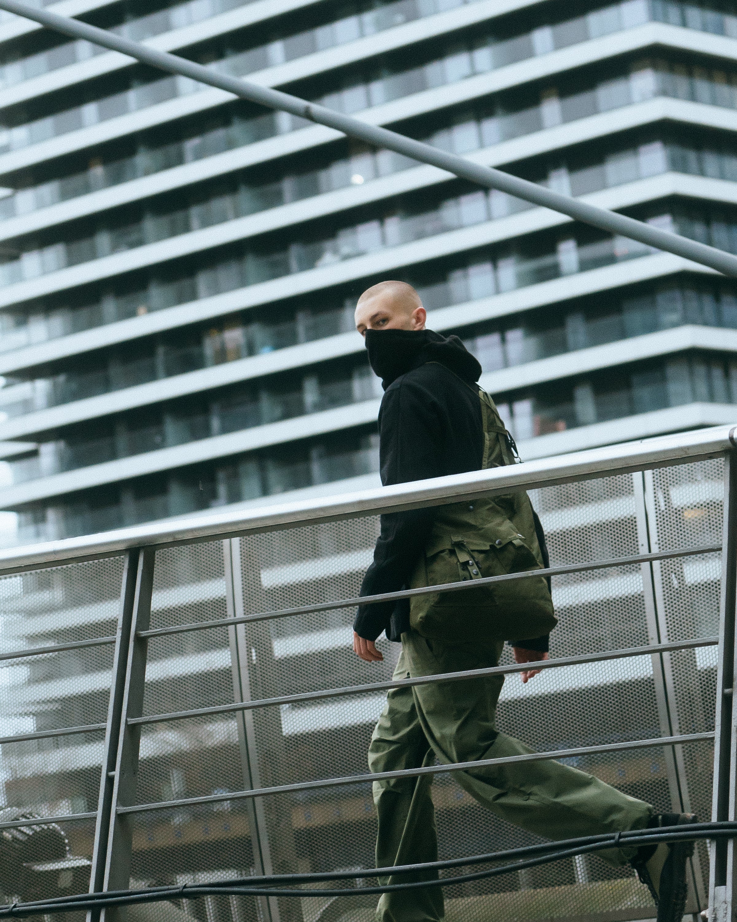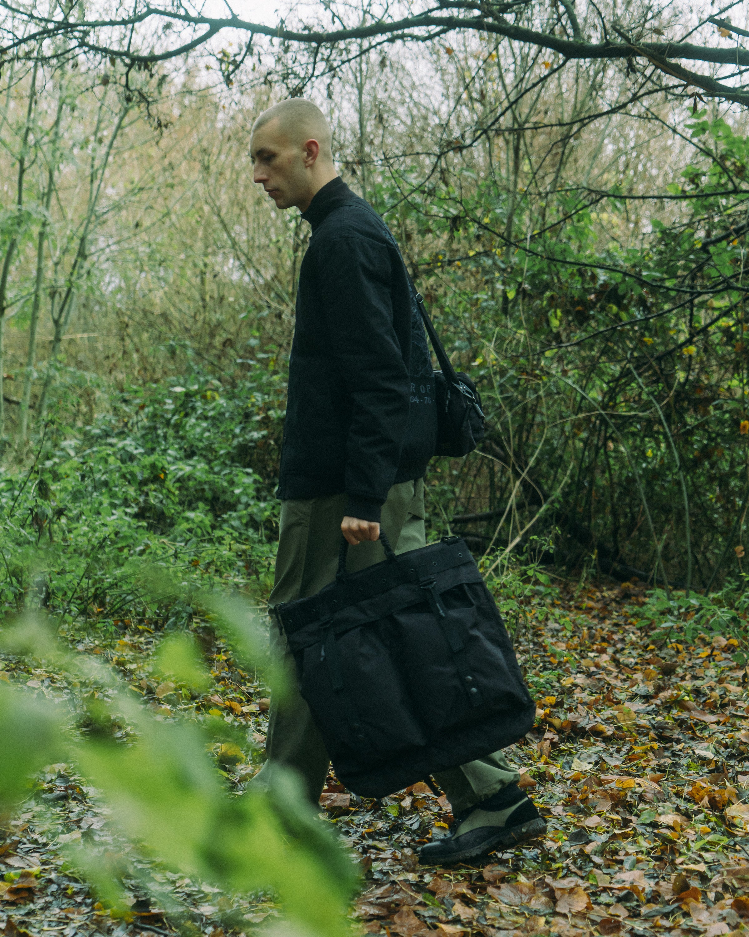 Model wears (from left): 1112 Maha M.A.L.I.C.E. Day Carry Bag, 1196 Maharishi Fracap Jungle Boot Low, 1114 Maha M.A.L.I.C.E. Backpack