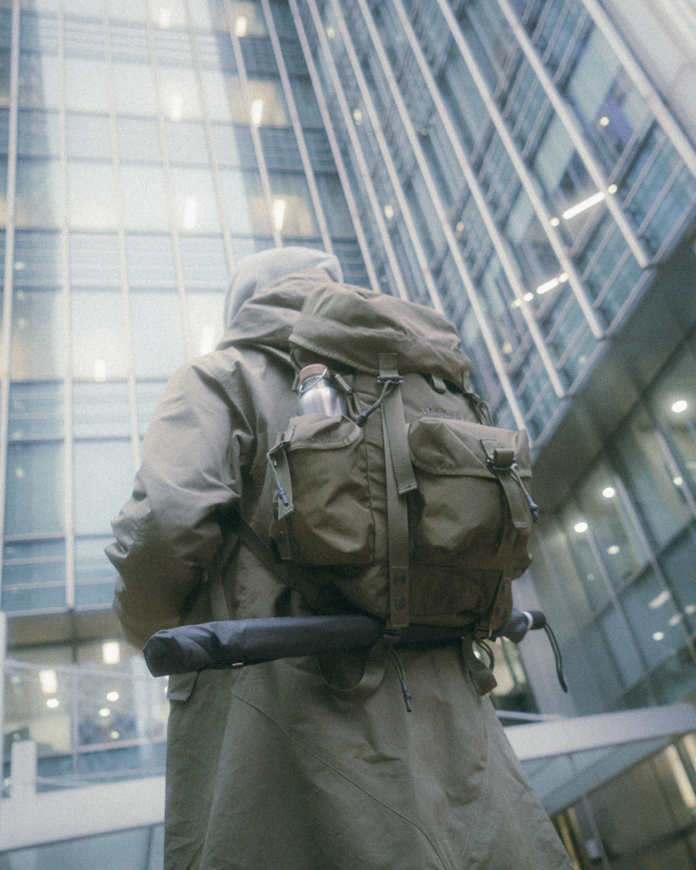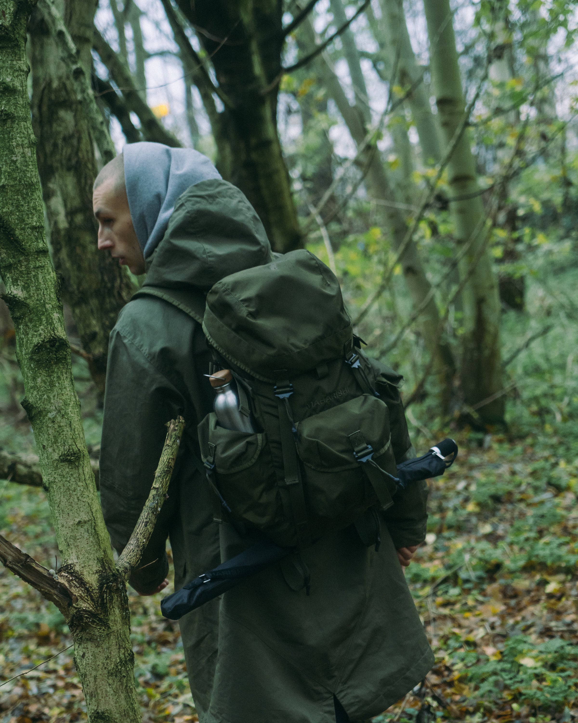 Model wears (from left): 1114 Maha M.A.L.I.C.E. Backpack, 1116 Maha M.A.L.I.C.E. Pouch Bag, 5025 Ventile® Hemp Articulated Parka