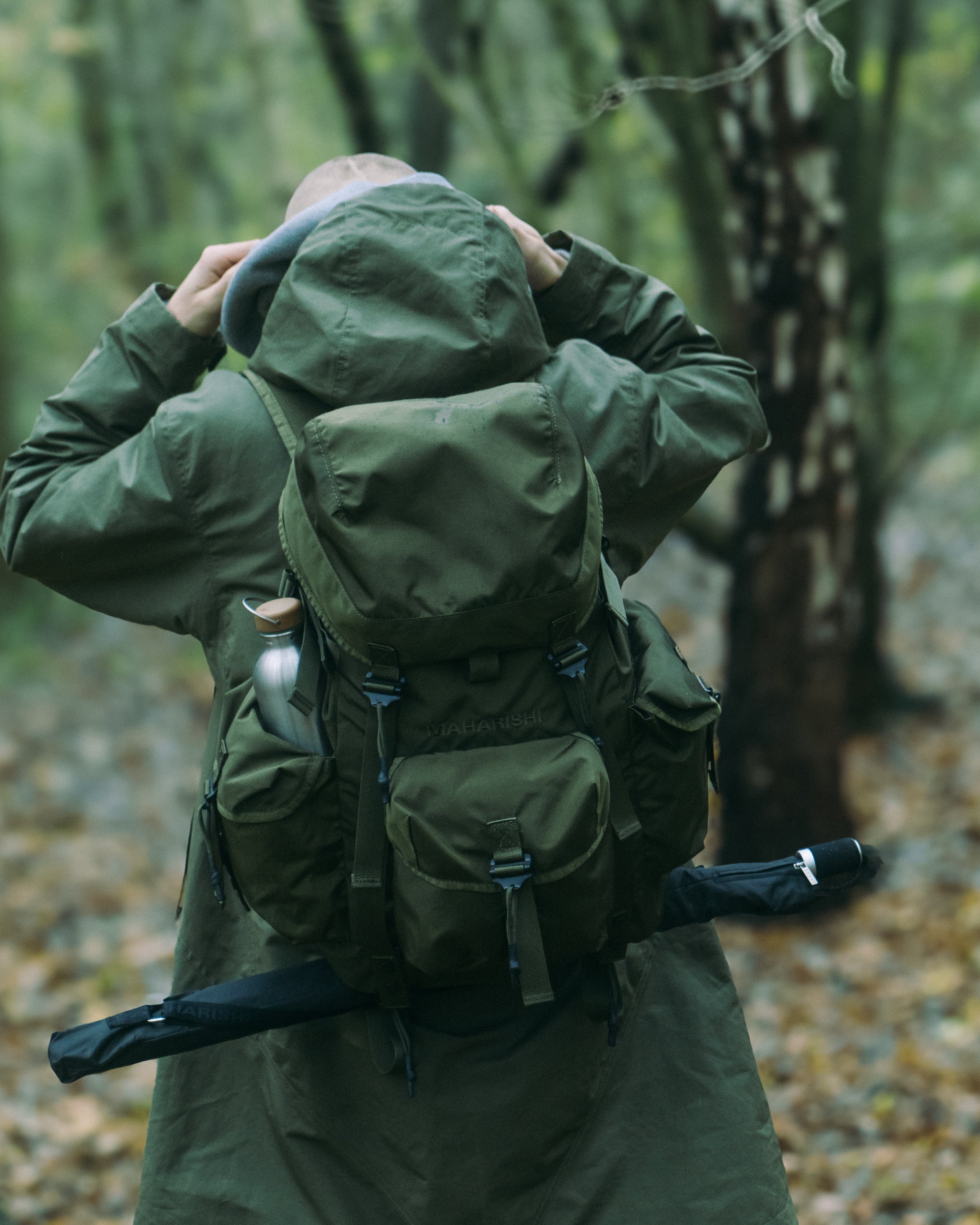 Model wears (from left): 1114 Maha M.A.L.I.C.E. Backpack, Maharishi x Black+Blum Steel Bottle, 9299 Maharishi x Senz · Original Umbrella