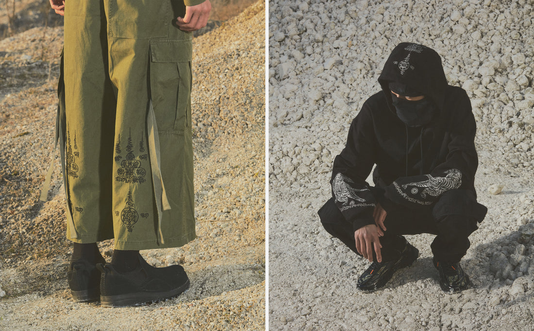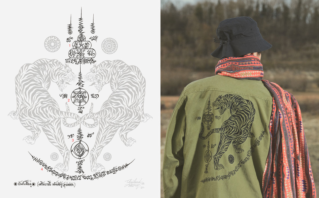 Maharishi’s SS23 yantras are illustrated by Thai guest artist, Amorn Settihorn and depict the dueling tigers talisman, which has the virtue of great power.