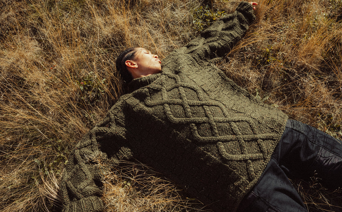 Exclusively for Maharishi, Kanata® hand knits two versions seen in a Cowichan woven to depict DPM: Golden Tigerskins and a mock neck crew celebrating indigenous Salish weaving techniques, showcasing two different Fair Isle patterns on the front and reverse.