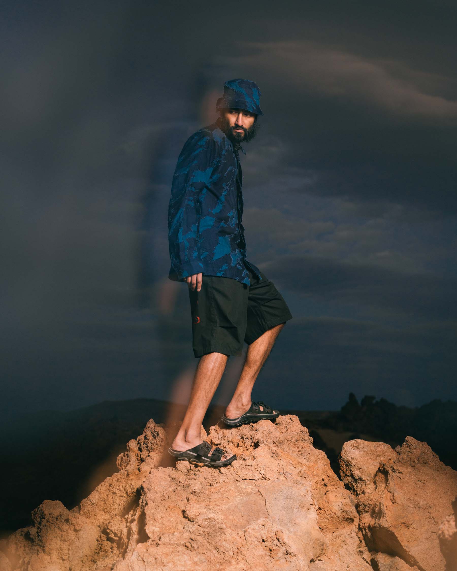 Maharishi's indigo-dyed styles include hemp-cotton, hand-machine-embroidered jeans, as well as utility shirts, hats, and track pants featuring the DPM: Bosai Forest Sparse pattern applied as a textured overlay.