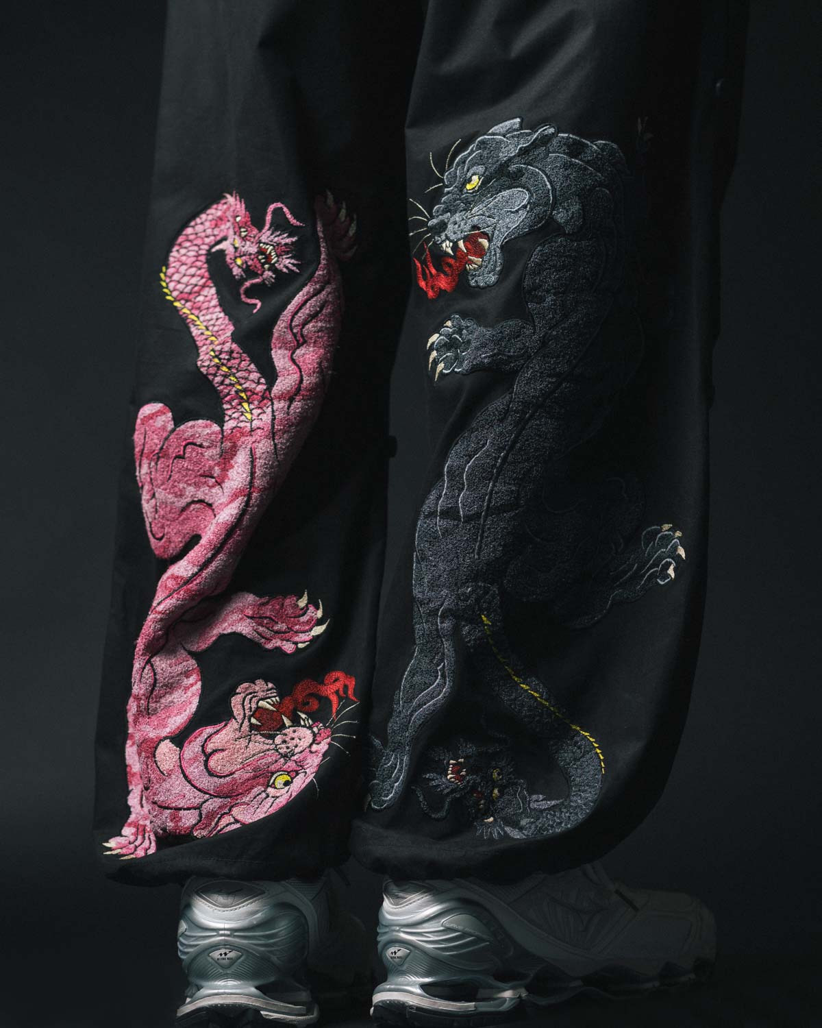 Detailed, hand-machined embroideries showcase the Panther Chimera, DPM: Bonsai Sparse, and Peace Dove artworks, as well as the Cyber Skeleton – an interpretation of the work of Japanese woodblock master Utagawa Kuniyoshi.