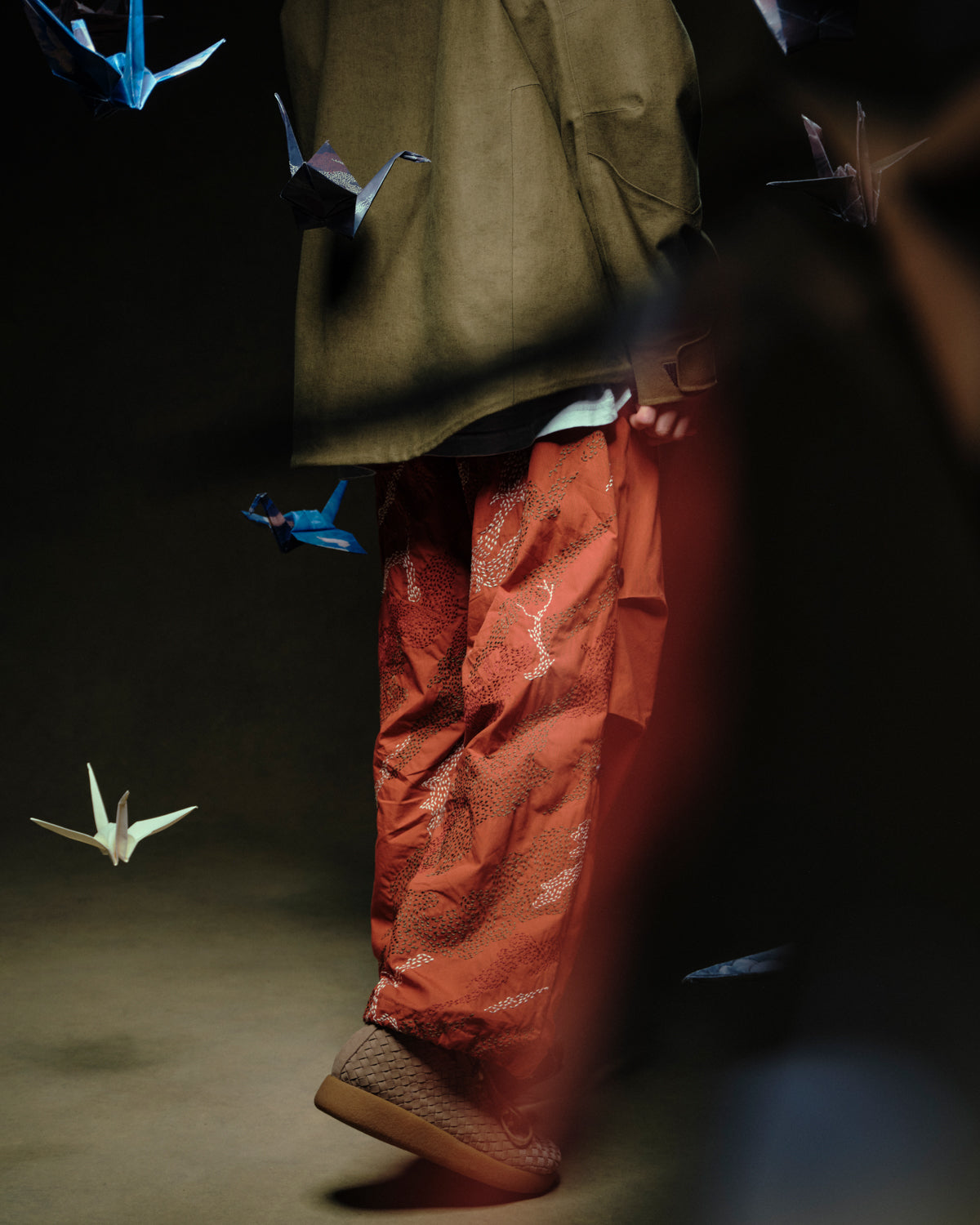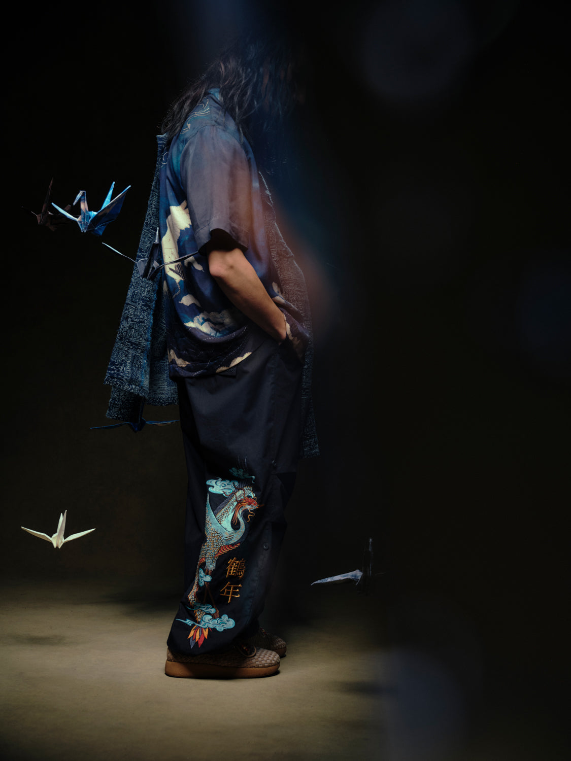 The collection incorporates artworks that reflect the crane’s symbolism to express a narrative of harmony. White Crane Kung Fu, originating in 17th-century Fujian and inspired by the graceful, evasive movements of cranes, embodies themes of balance, resilience, and inner strength—qualities also reflected in the cultural symbolism of cranes across Asia. Furthermore, origami cranes, especially through the story of Sadako Sasaki, have become global symbols of healing and hope, as illustrated in Hardy Blechman’s book DPM: Disruptive Pattern Material. The crane is reimagined through several artworks in this collection, from classic depictions and origami cranes, to juxtapositions with mechanical cranes that reference Maharishi’s respect for technological innovation.