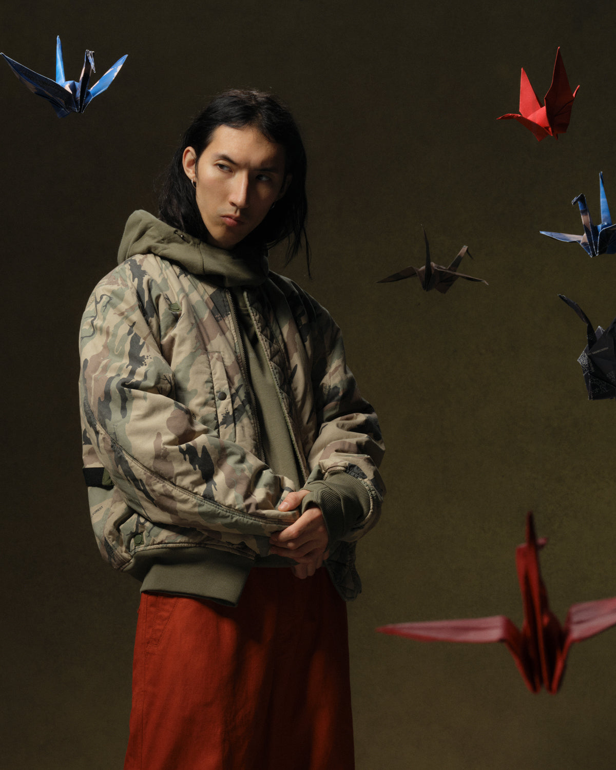Maharishi’s signature camouflage, DPM: Bonsai Forest, is intricately applied to staple silhouettes like Original Snopants® using sashiko-style embroidery that gives the pattern a layer of textured depth. The traditional Japanese stitching forms rhythmic, grain-like patterns across the camo, elevating the garment with durability and detail. The camo is also reinterpreted in DPM: Distorted Bonsai Forest, a warped and more muted evolution of the original pattern, offering a subtler, abstracted aesthetic while retaining its symbolic connection to nature and pacifism.