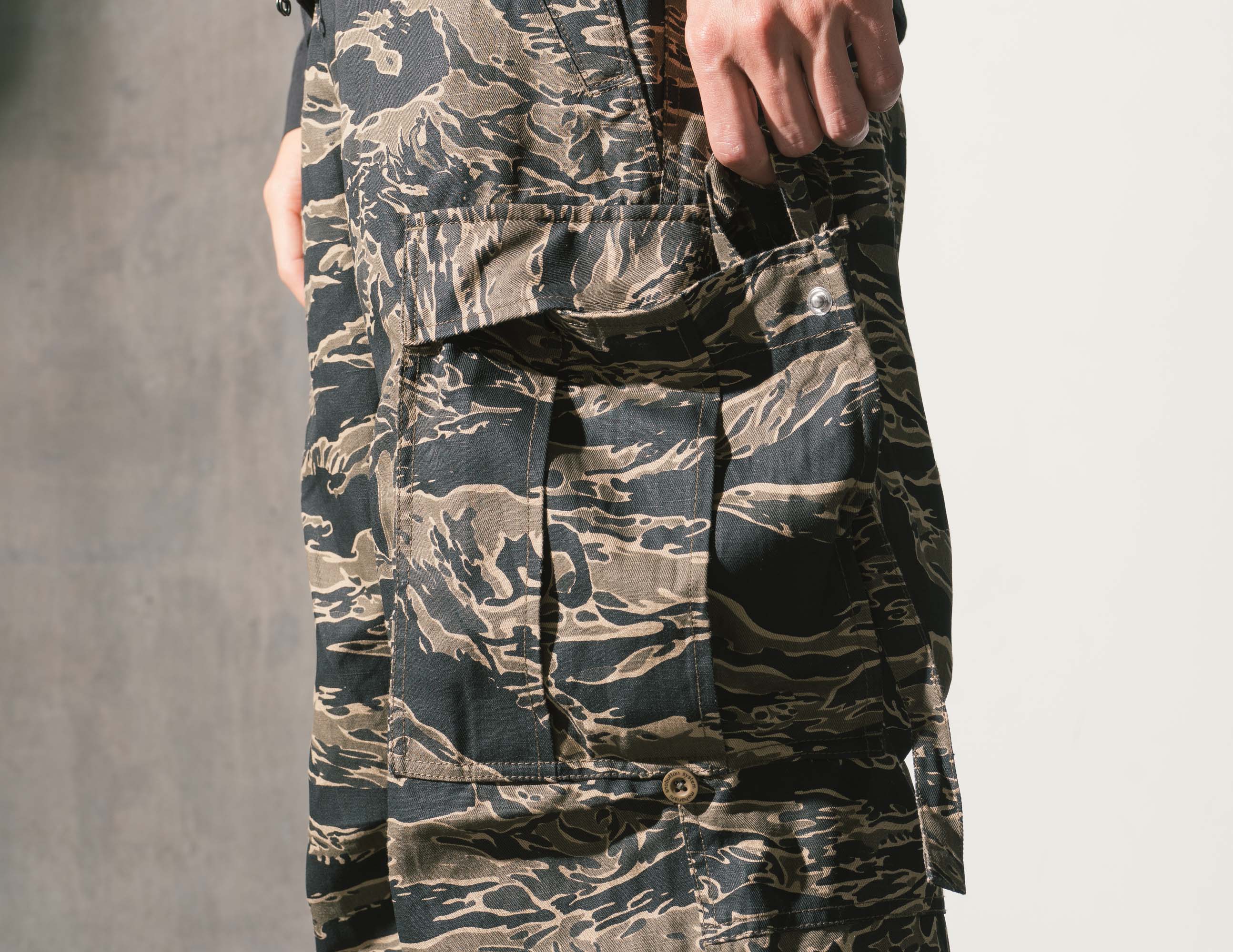 Cargo pants are a staple silhouette for Maharishi, combining practicality with cutting-edge design. Rendered in a range of materials, from organic cotton/hemp to more technical choices like Cordura ripstop. A feature on the original M51 pants, the cargo straps were designed to be tied around the leg to secure cargo within the pocket. They can be concealed or hidden within the pocket by passing them through a small buttonhole.