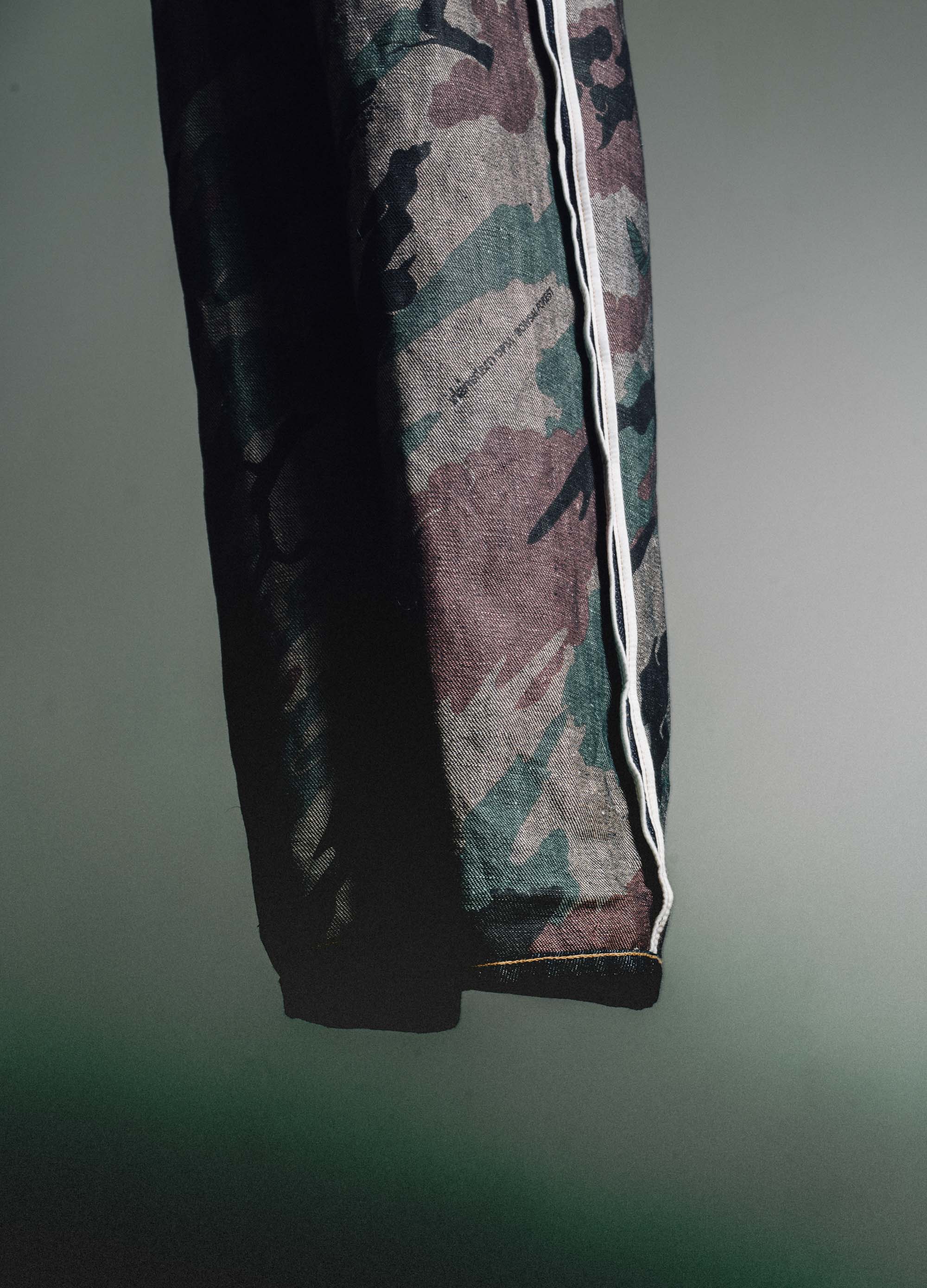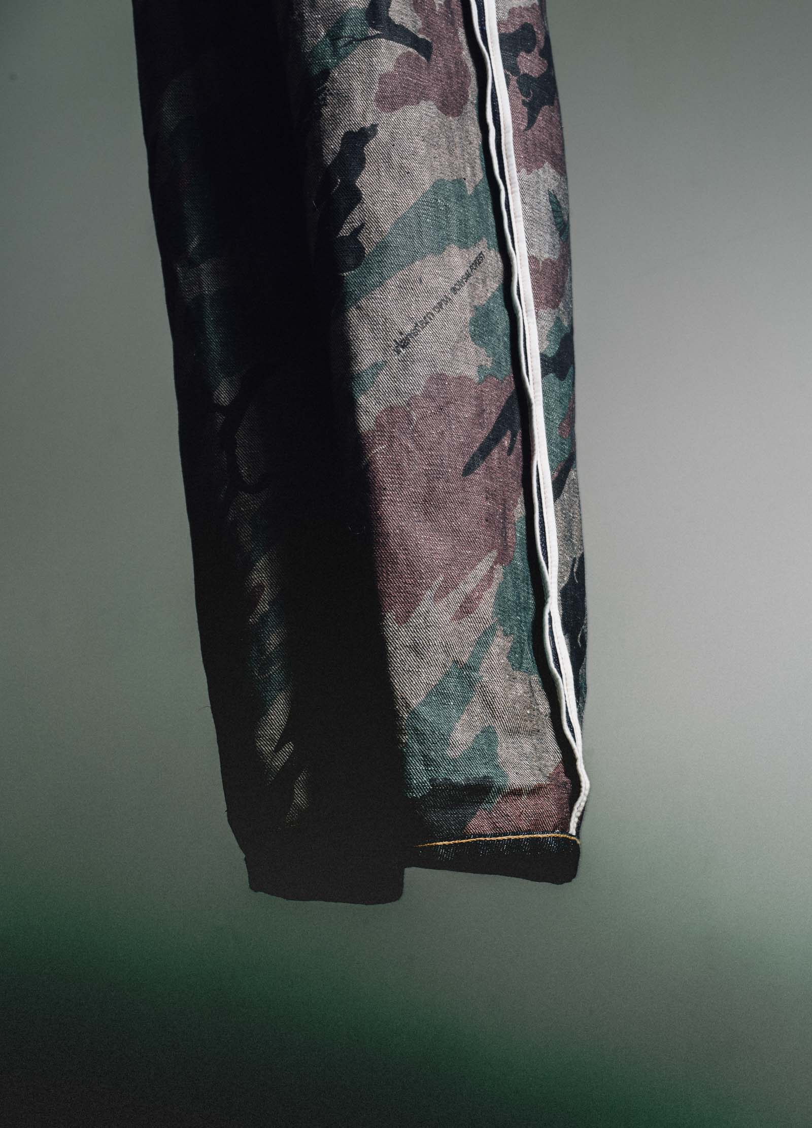 Maharishi’s denim offering fuses durability with craft, cut from sustainable hemp–cotton blends that balance strength and breathability. Relaxed silhouettes are elevated with hand-machine embroidery and signature DPM: Bonsai Forest linings, reflecting harmony between utility and artistry. Each piece is designed for longevity, with free custom hemming available through the Soho Maha Tailor Shop.