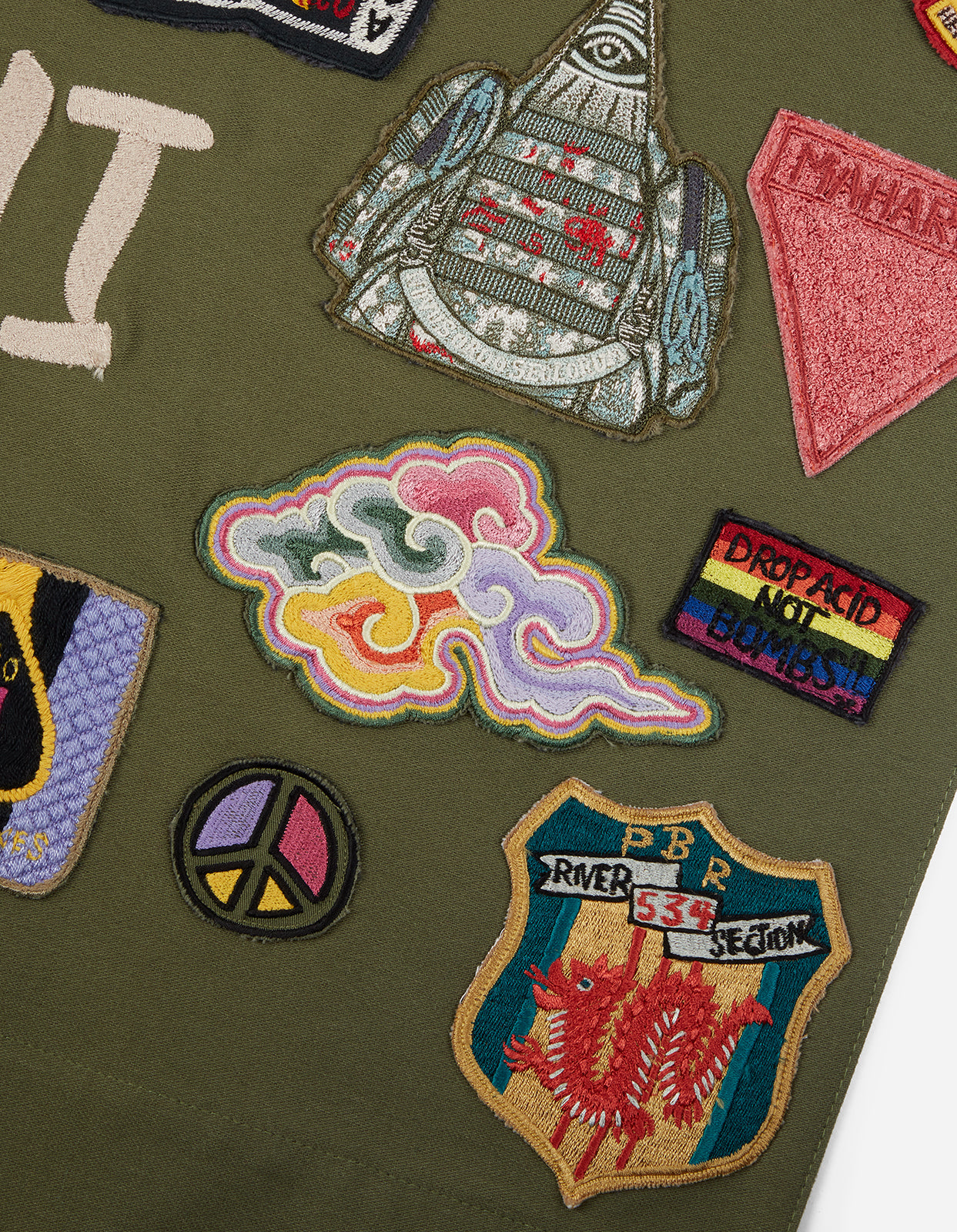 Decorative wall tapestry featuring an array of patches by MAHAPATCHCO. — a sister company to the Maha Tailor Shop — explores the Entertainer and Tour Jackets worn during the Vietnam War era.