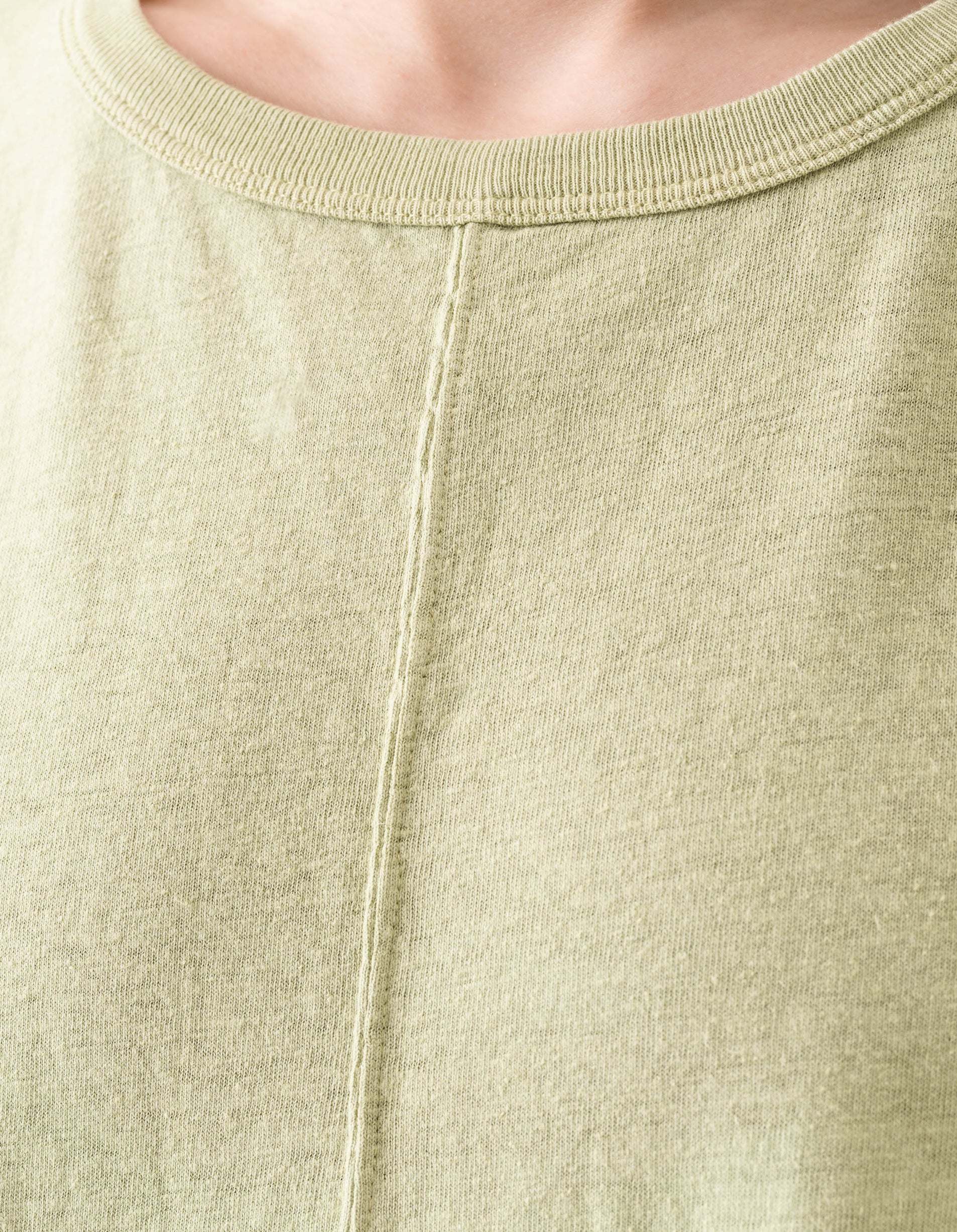 The Hemp Cross Loose t-shirt has been garment-dyed in moss green and stonewashed for a soft and worn-in finish. Stylized contrast seams can be found on the front and reverse, exposing the cut & sew nature of the garment.