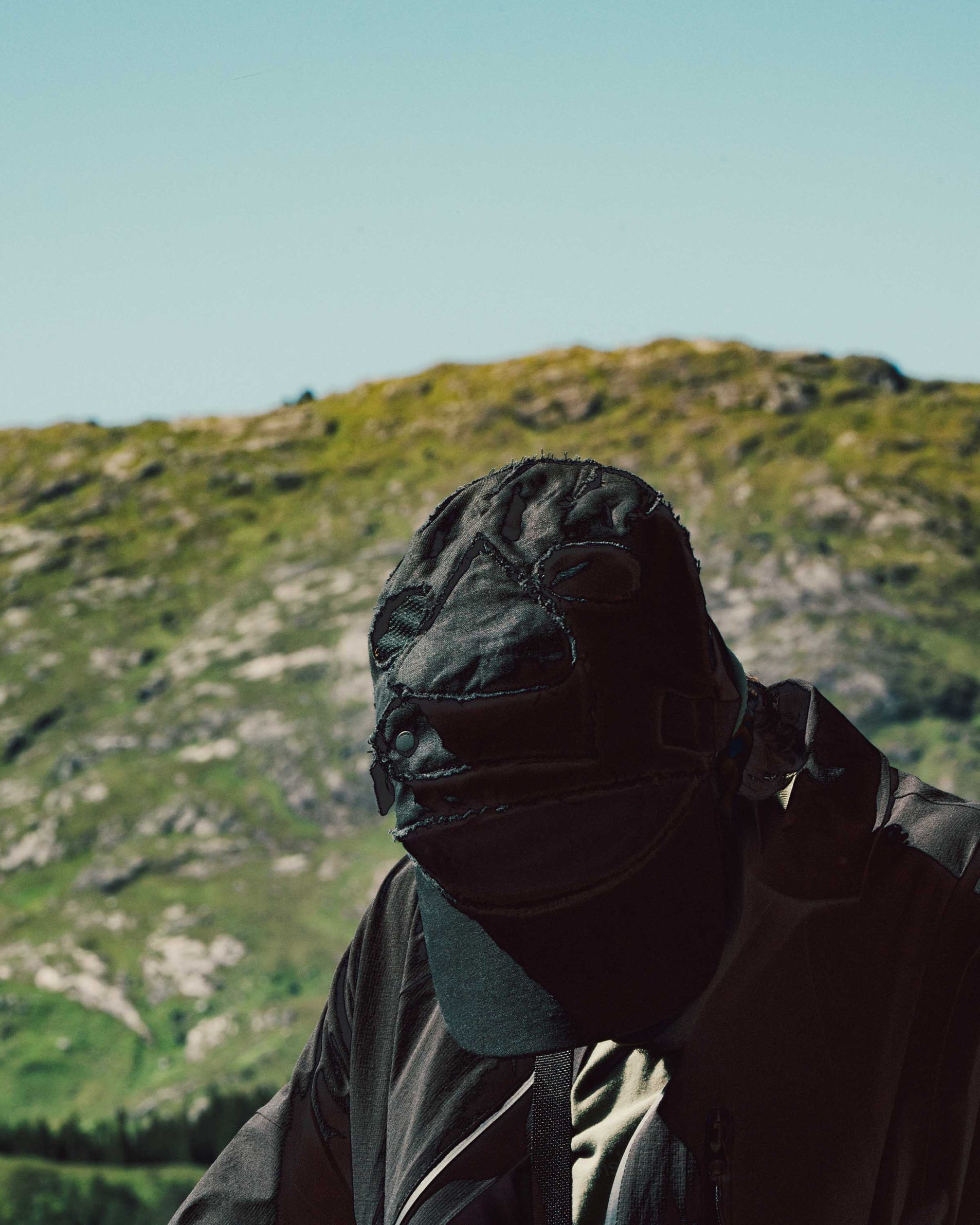 Multi-function hat/mask in black, that has been inspired by a U.S. 'extended cold weather system' face mask. Featuring press snap mouth cover, mesh eye covers and a stretch back panel allow for a secure fit when worn as a mask.