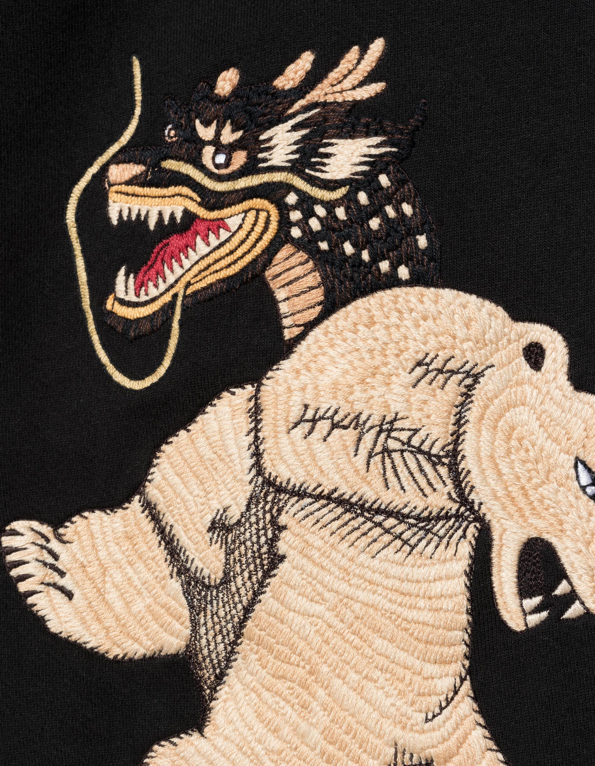 This inspiration is brought to life through intricately embroidered designs, including yin-yang-inspired bears that represent the merging of polar opposites, a concept at the heart of Maharishi’s philosophy.