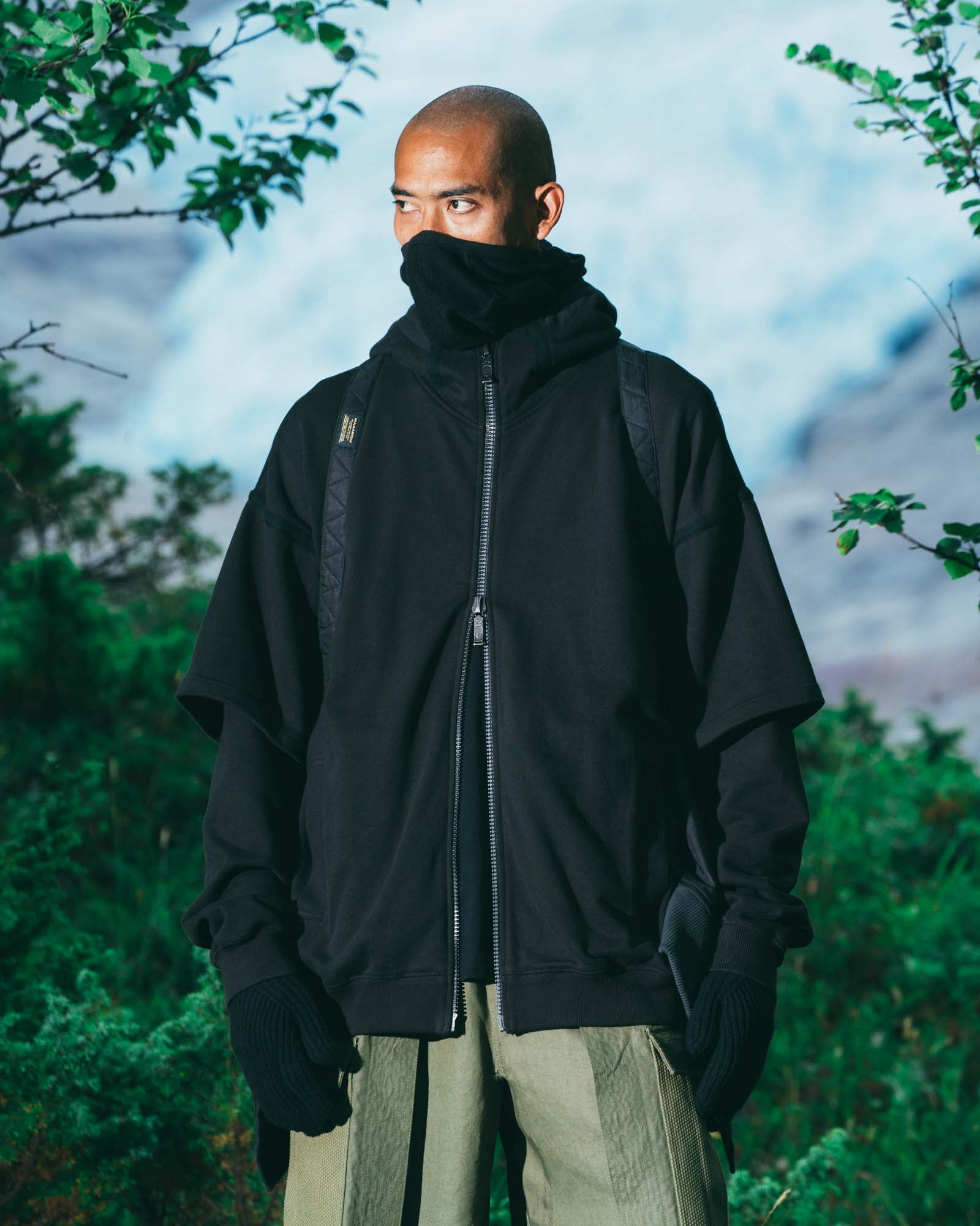 Oversized hooded sweat in black, constructed from organic cotton sweat. Featuring a layered sleeve, drop shoulder and heavy duty two-way zip front closure.