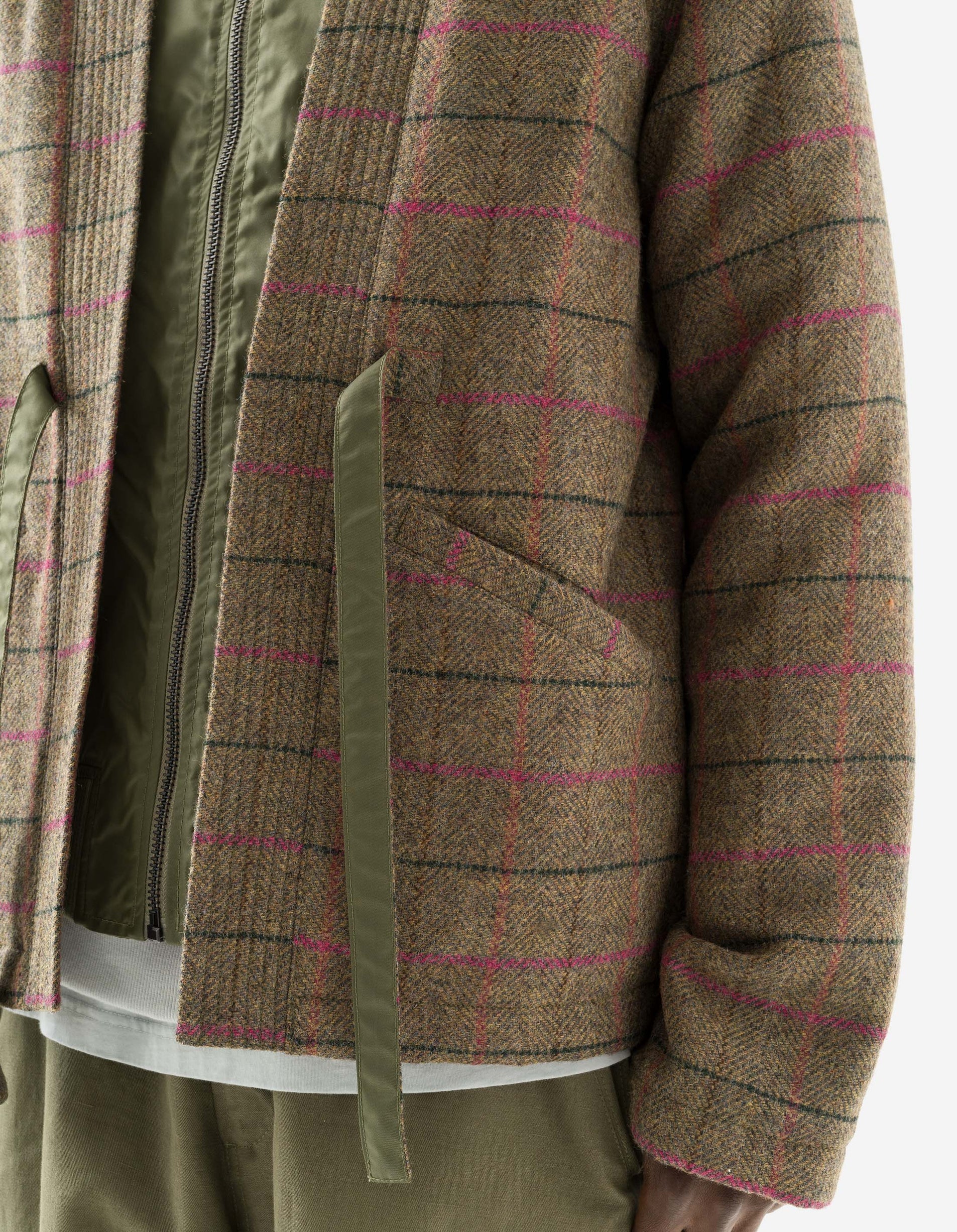 Relaxed fit kimono in olive with internal fitted MA-1 flight jacket. The outer is constructed from a panelwork of British-made check wool and tonal flight nylon is featured throughout the sleeve and pocket trims. The inner MA-1 is fitted with a zip closure, internal carry straps and hi-vis orange lining.