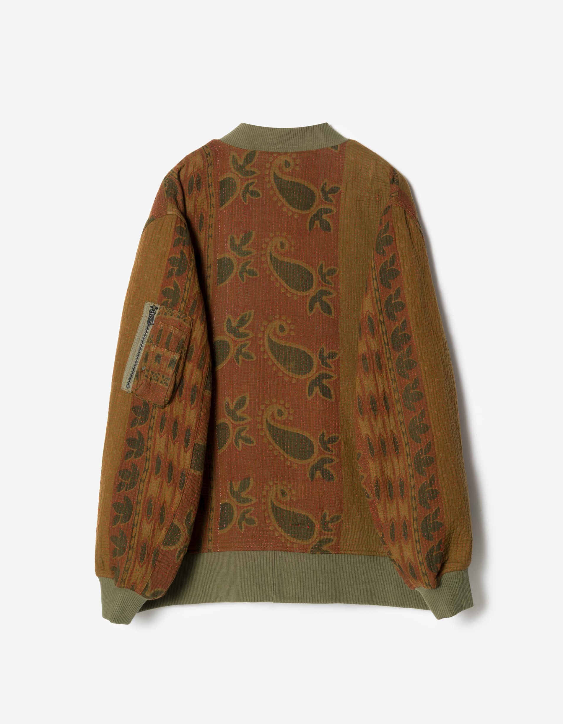 Reworking the classic MA-1 bomber silhouette, originally developed for mid-20th-century military flight use, this jacket is constructed from upcycled Kantha quilts and features a kimono style collar and tie closure. Traditionally made by layering and hand-stitching vintage textiles in South Asia, Kantha fabric embodies a culture of repair, reuse and longevity — values that closely mirror Maharishi’s own approach to design.