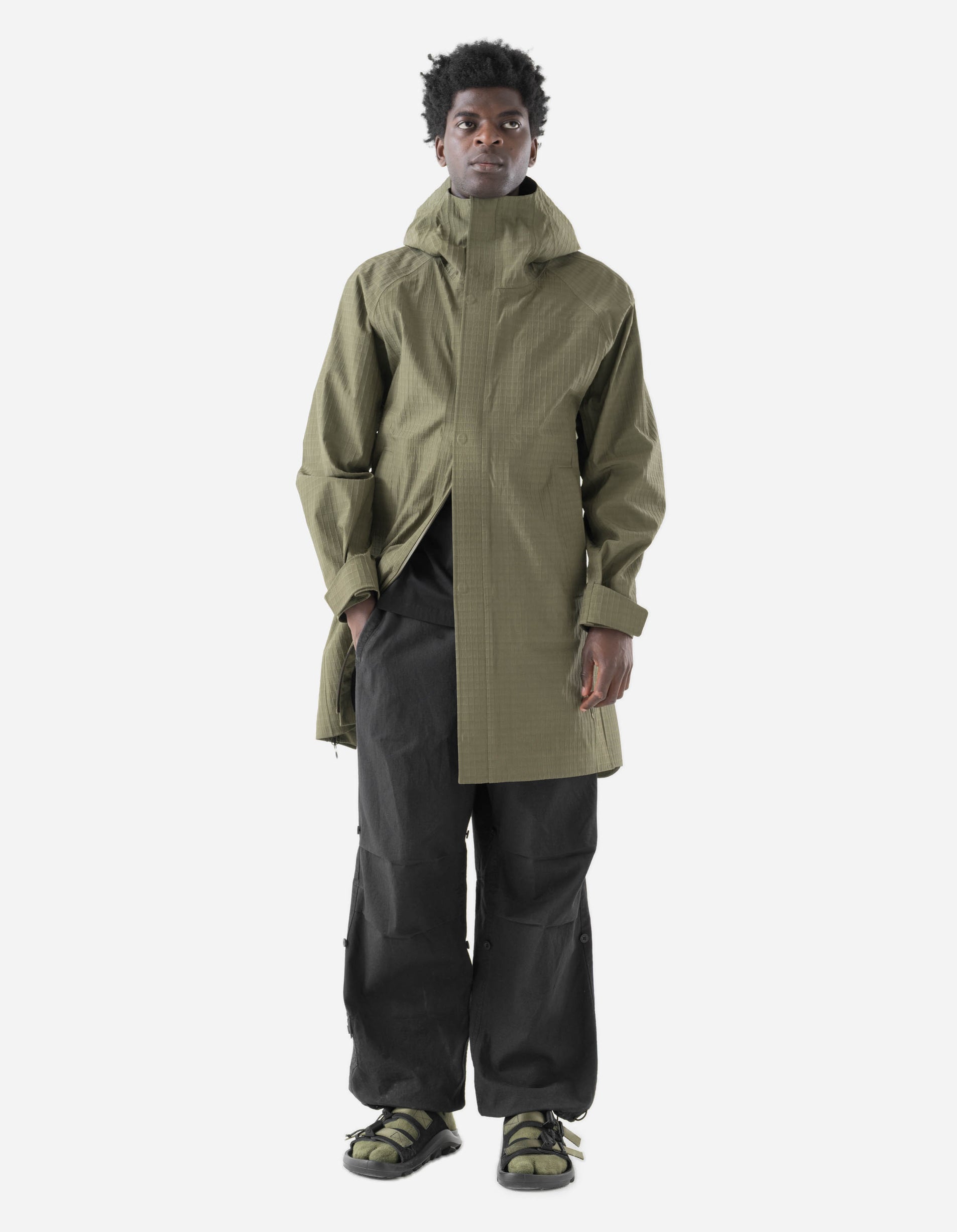Articulated sleeve patterning enhances mobility, while the Snocord hood cinch and wide Velcro® cuff fastenings allow for a precise, streamlined fit. Constructed from recycled fibre ripstop nylon in olive, the fabric offers water resistance and breathability with a crisp handle and structured feel.