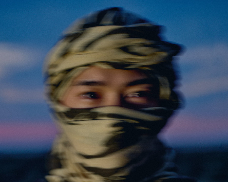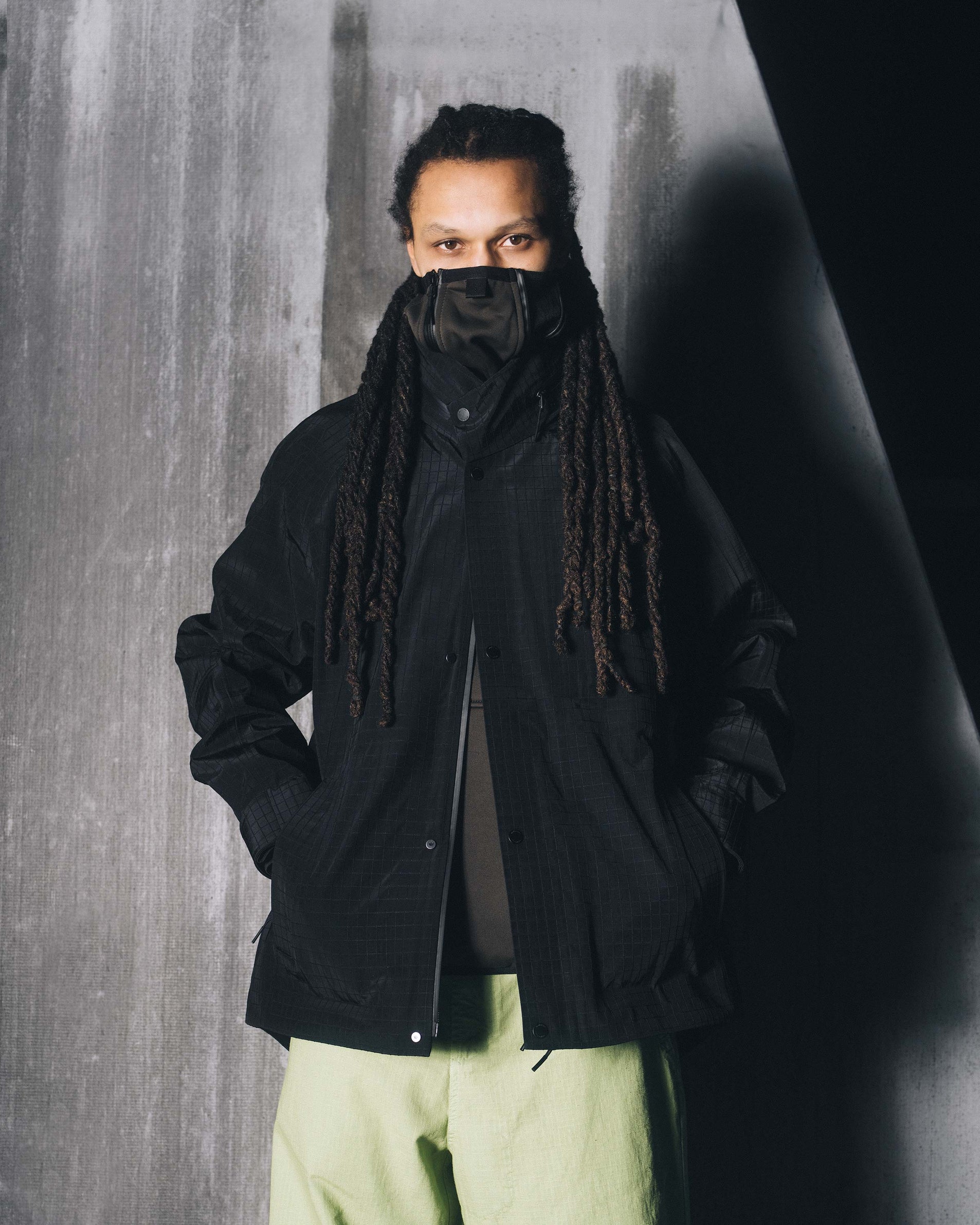 Engineered with articulated sleeve patterning for improved mobility, the jacket features a discreet packaway hood integrated into a hanbok-style collar, referencing Korean design influence and enabling a clean, versatile silhouette. The structured ripstop fabric has a crisp handle, reinforcing the jacket’s refined technical profile.