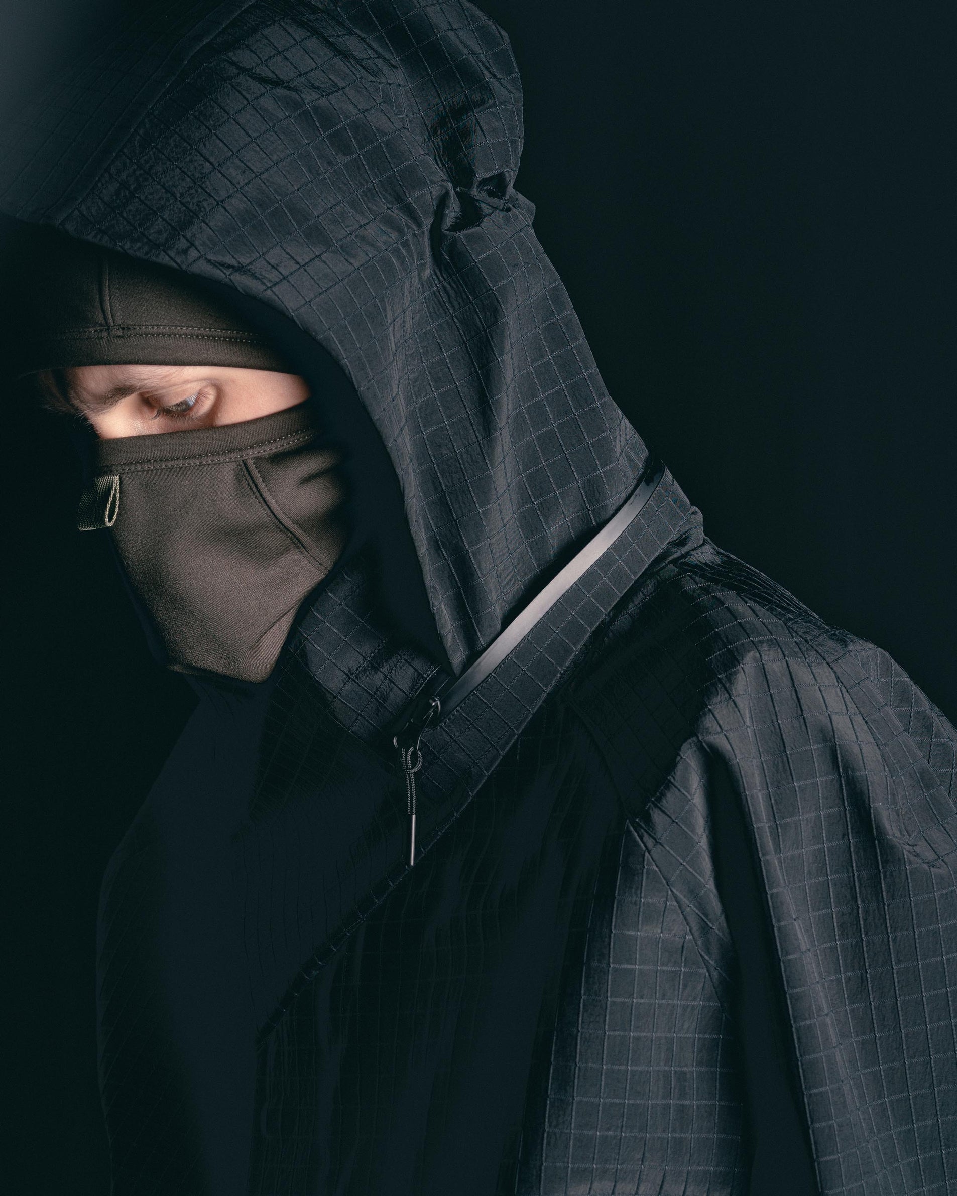 The Waterproof Tech Jacket in black, constructed from a recycled fibre three-layer ply nylon, offering water resistance and breathability. Fully seam-sealed for enhanced weather protection, engineered with articulated sleeve patterning and Snocord hood cinch for an adjustable fit. The jacket features a removable hood and kimono-style collar for a versatile wear.
