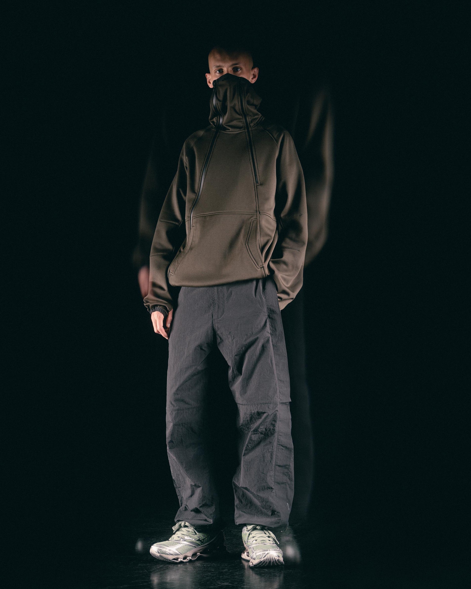 Technical Hakama Pant in black, a contemporary adaptation of the traditional Japanese riding trouser, is fitted with integrated Snocord adjustment and the waist and secure cargo zip pockets. Wide-leg fit and deep rise, engineered for articulation at the knee.