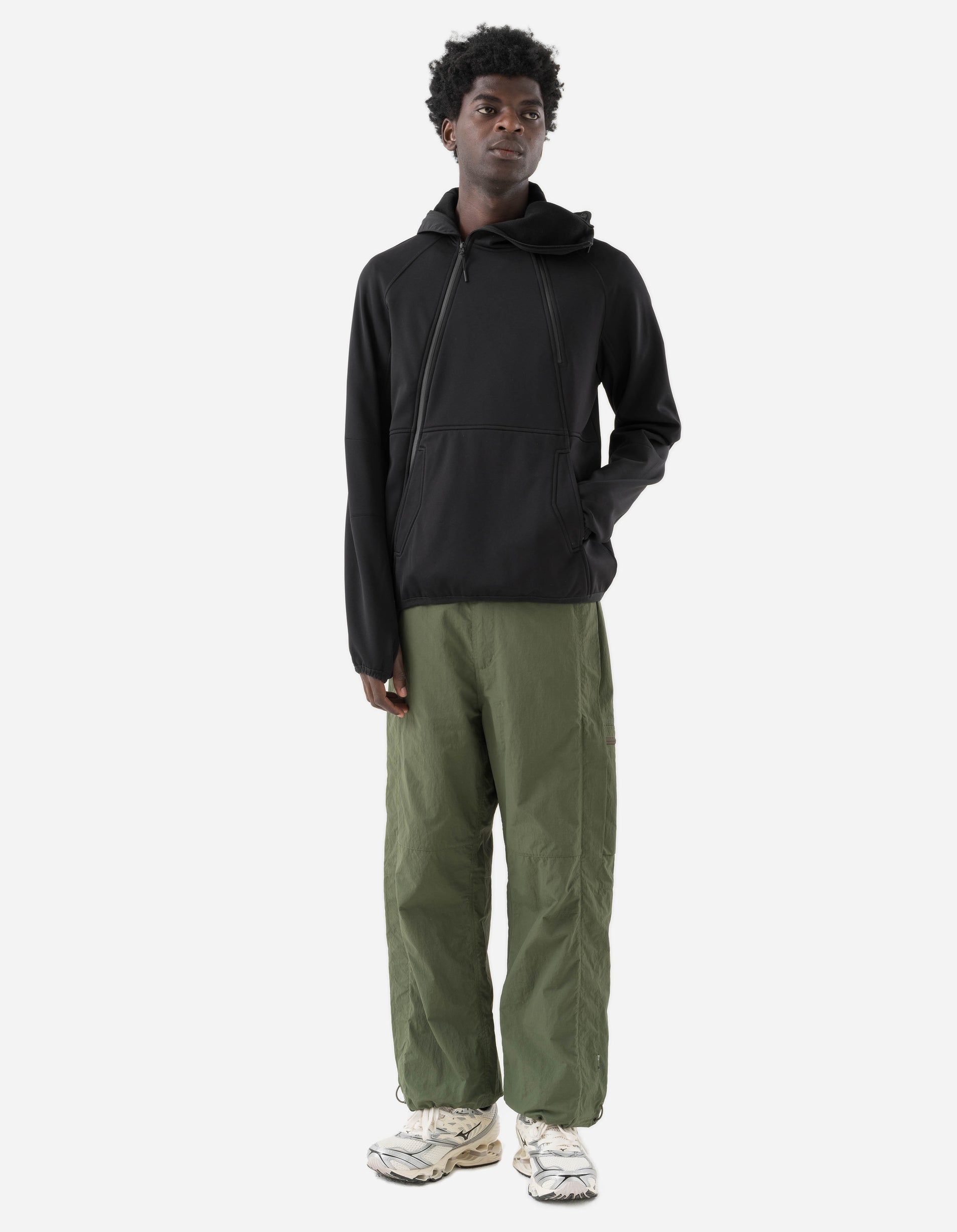 Technical Hakama Pant in olive, a contemporary adaptation of the traditional Japanese riding trouser, fitted with integrated Snocord adjustment and the waist and secure cargo zip pockets. Wide-leg fit and deep rise, engineered for articulation at the knee.