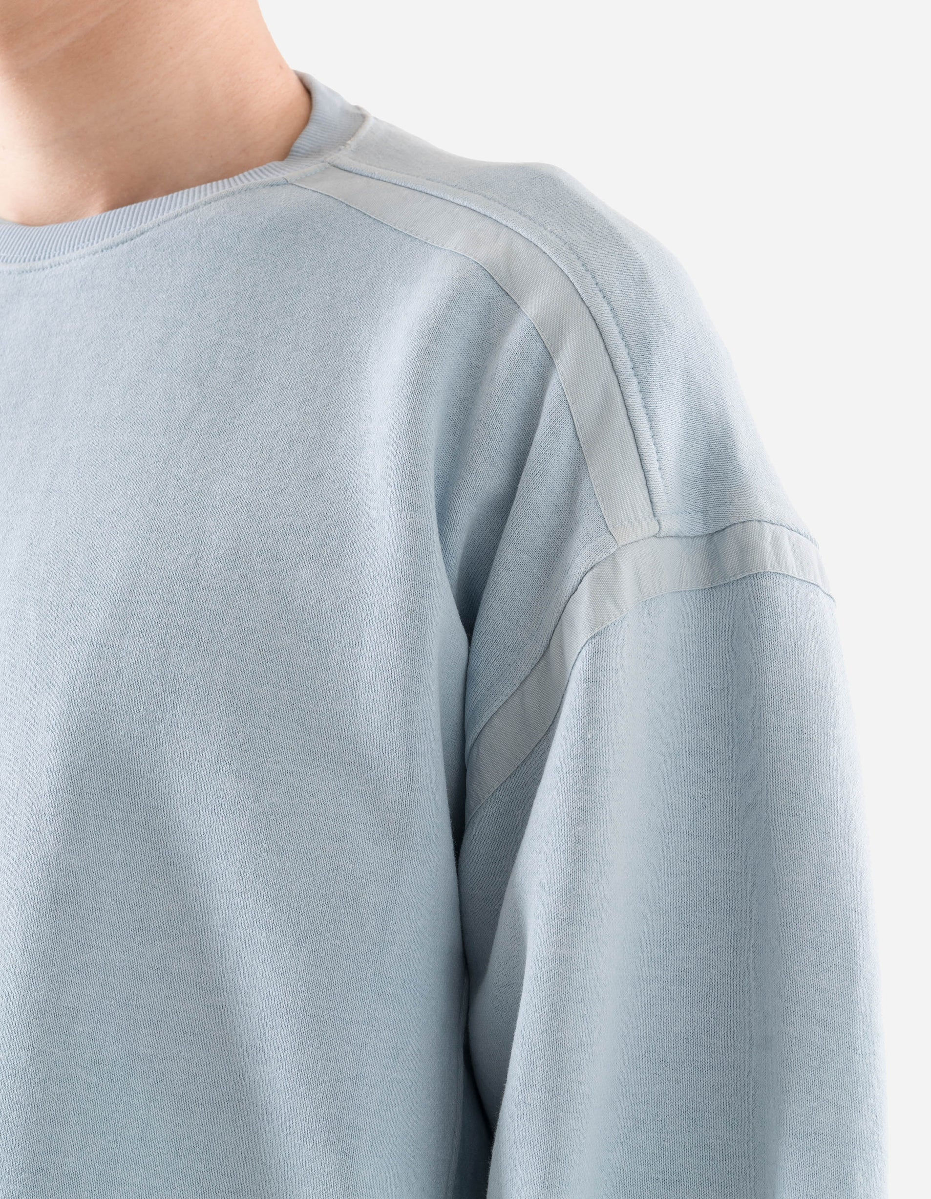 Staple crew-neck sweatshirt Garment-dyed in light blue. Finished with shoulder seam piping, articulated sleeve patterning and pit vents. Constructed from organic hemp-cotton and cut to relaxed fit.
