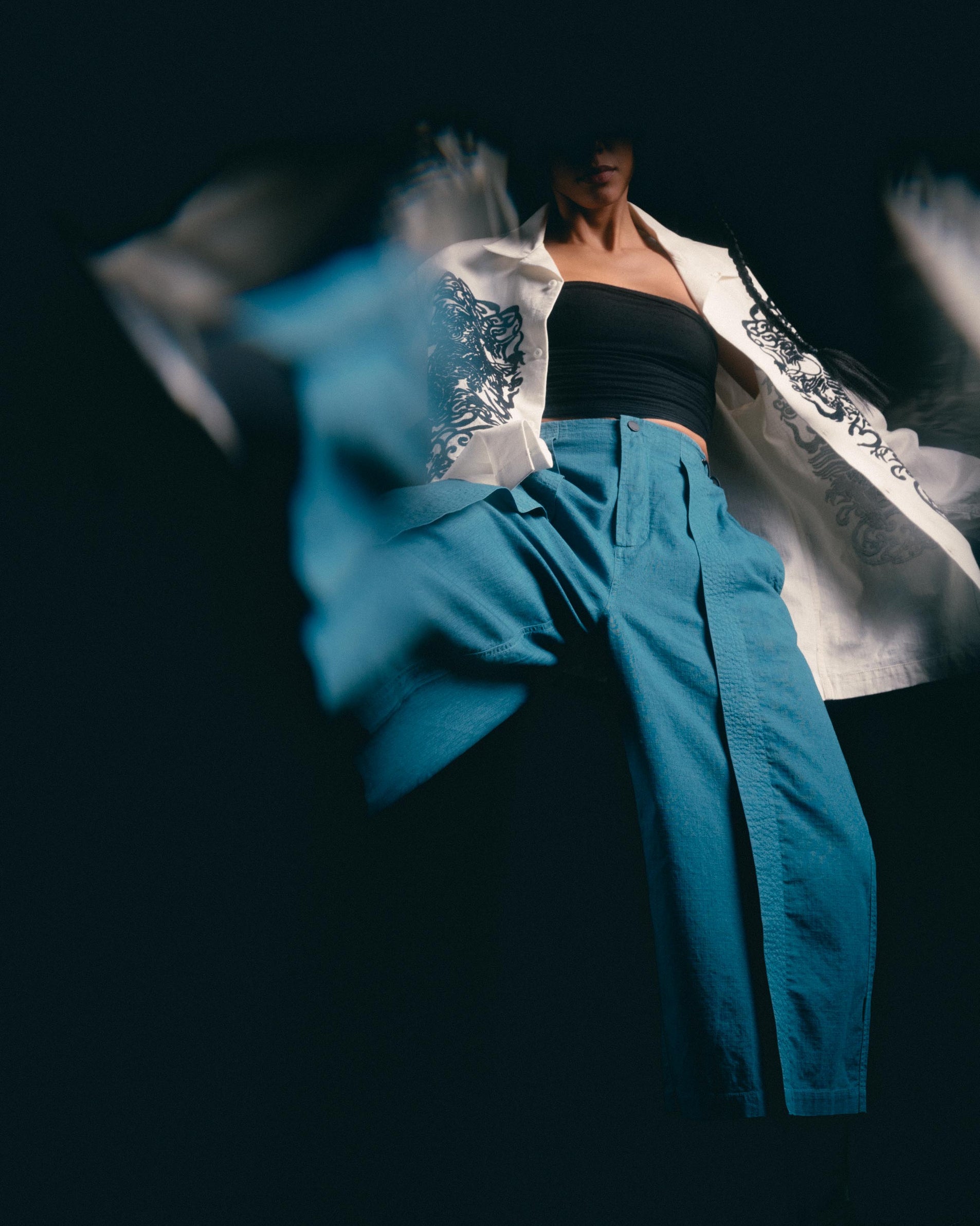 The Cropped Hakama Pant, cut to a cropped length and loose fit. Constructed from a lightweight ripstop hemp-cotton in a garment-dyed airforce blue for an aged and worn-in finish. The Snocord system has been fitted at the waist for a wide range of fit adjustment.