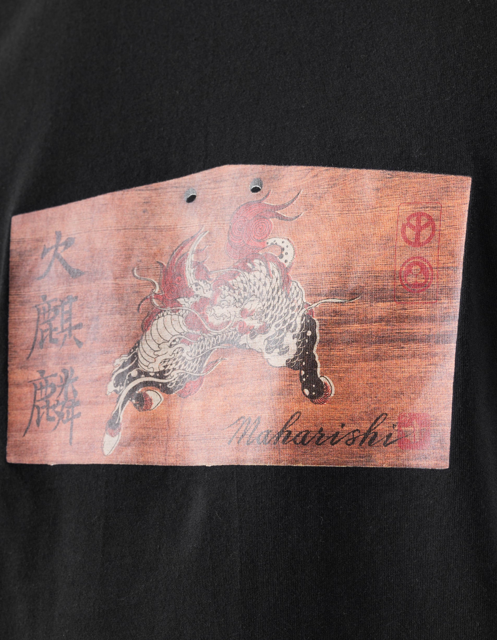 Short-sleeve cotton t-shirt in black, constructed from organic cotton jersey with a Kirin-themed print characterising a Japanese Horse Prayer Plaque. These plaques were used by Shinto and Buddhist worshippers to write prayers or wishes on.