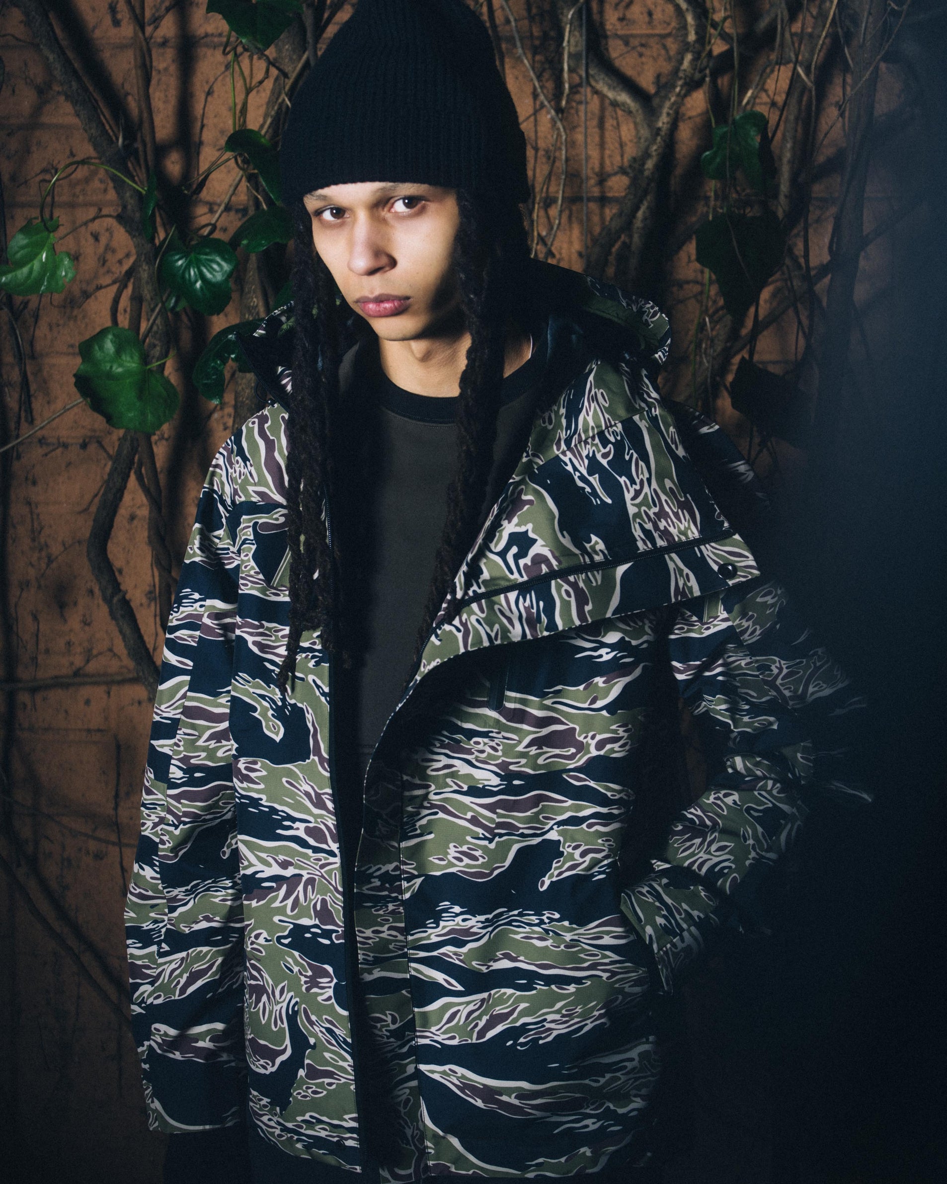 All-over DPM: Bonsai Tigerstripe has been featured on the parka. This latest iteration of Maharishi's house pattern is layered with deeper symbolism, where the disruptive stripes are infiltrated by icons of peace — the original dragon, heavenly clouds, and meditative imagery that transform a once combative design into one that carries balance and reflection.