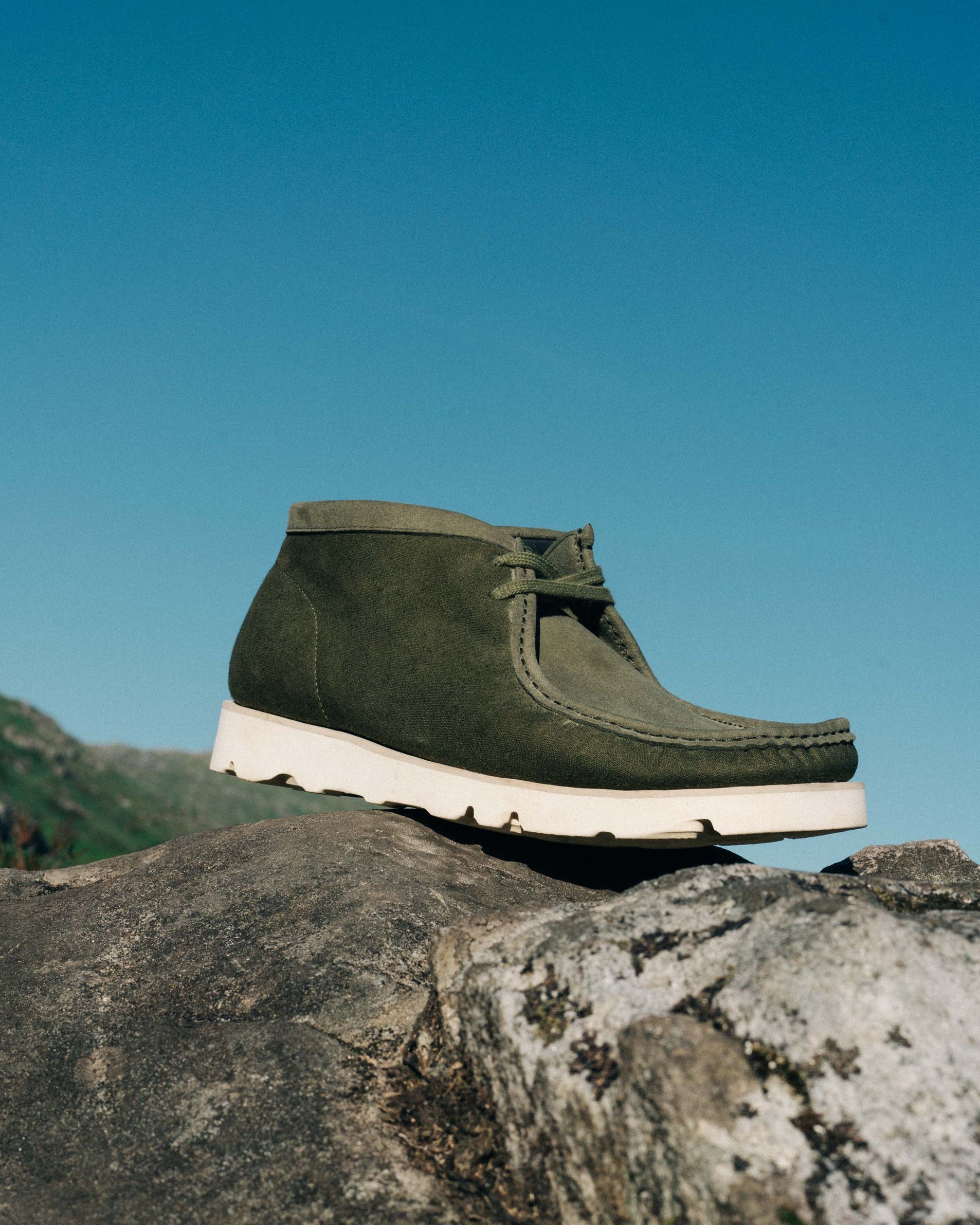 These two iterations of their P404, the iconic hand-stitched moccasin boot and constructed from a water resistant linen hemp, utilised in both black and olive colourways.