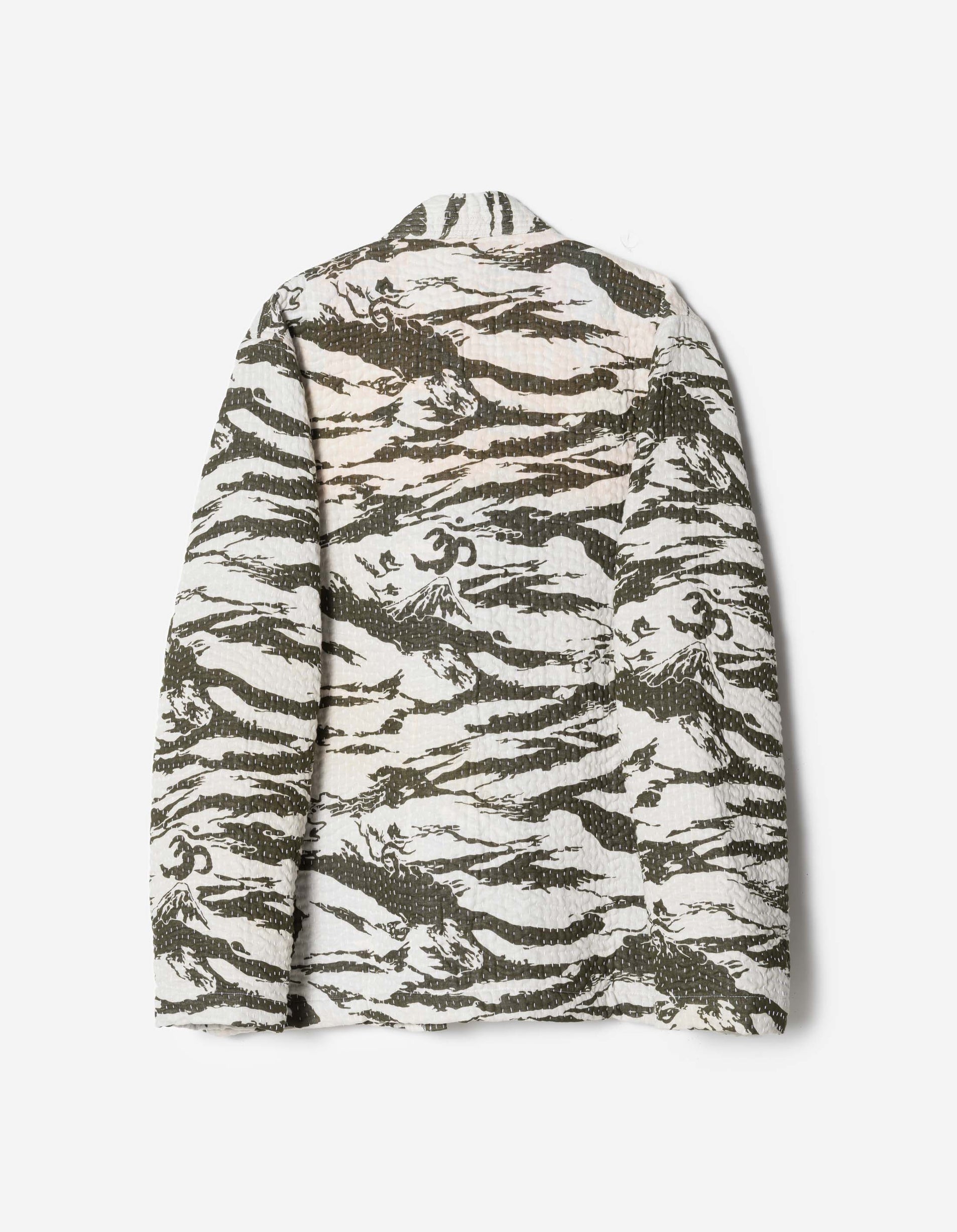 This latest iteration of Maharishi's house pattern is layered with deeper symbolism, where the disruptive stripes are infiltrated by icons of peace — the original dragon, heavenly clouds, and meditative imagery that transform a once combative design into one that carries balance and reflection.