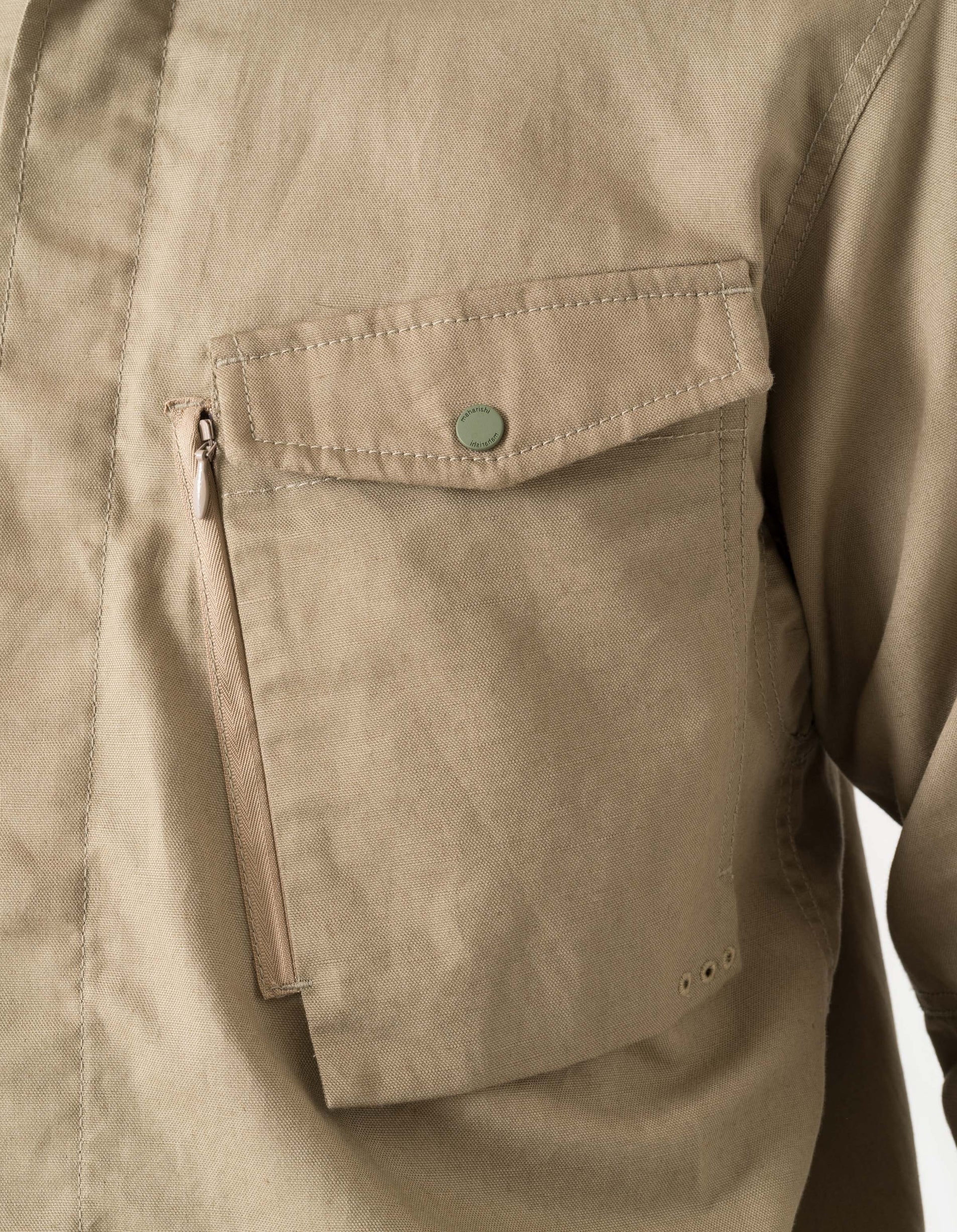 Long-sleeve shirt in Maha Sand, constructed from a water resistant hemp cotton. Featuring two large angled chest pockets with secure zipped compartment, a concealed button front opening, and pre-formed sleeves for elbow articulation.
